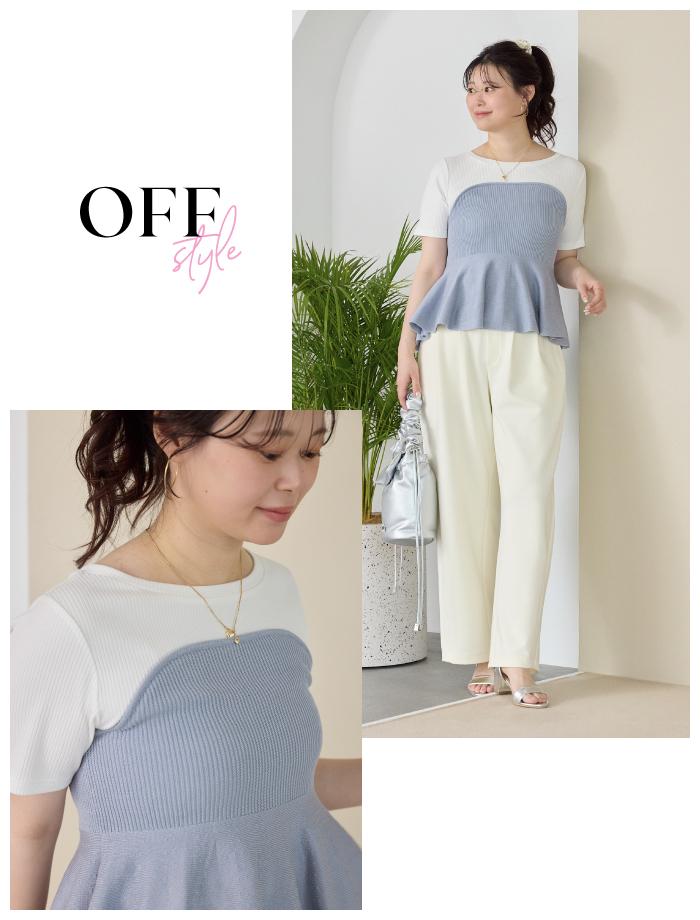 ビスチェをレイヤードしたようなドッキングデザインが目を惹くトップスに、クリーンなワイドパンツを合わせた爽やかな「オフスタイル」です。ペプラムシルエットが腰回りをカバーしつつ、サックスブルー×ホワイトの配色が、春のお出かけにぴったりな清涼感とフェミニンな雰囲気を演出します。