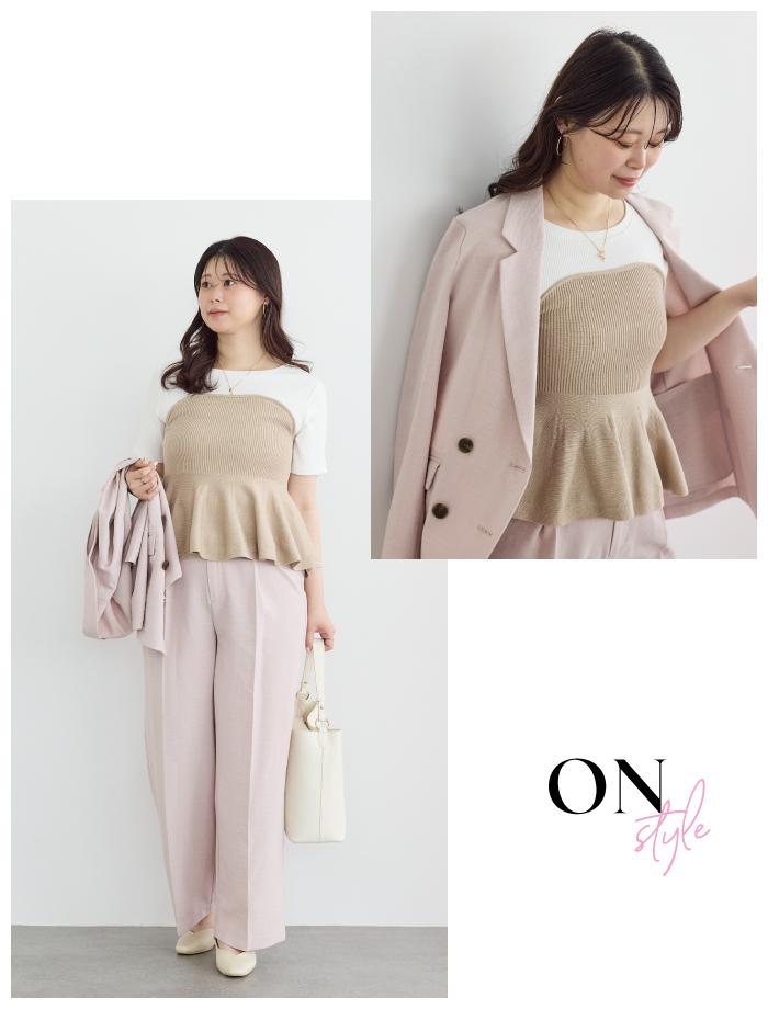 ベージュのドッキングトップスに淡いピンクのセットアップを肩掛けした、こなれ感漂う「オンスタイル」です。華やかなペプラムデザインが、かっちりしがちなジャケットスタイルに程よい甘さと立体感をプラスし、優しげで仕事のデキる女性を演出します。