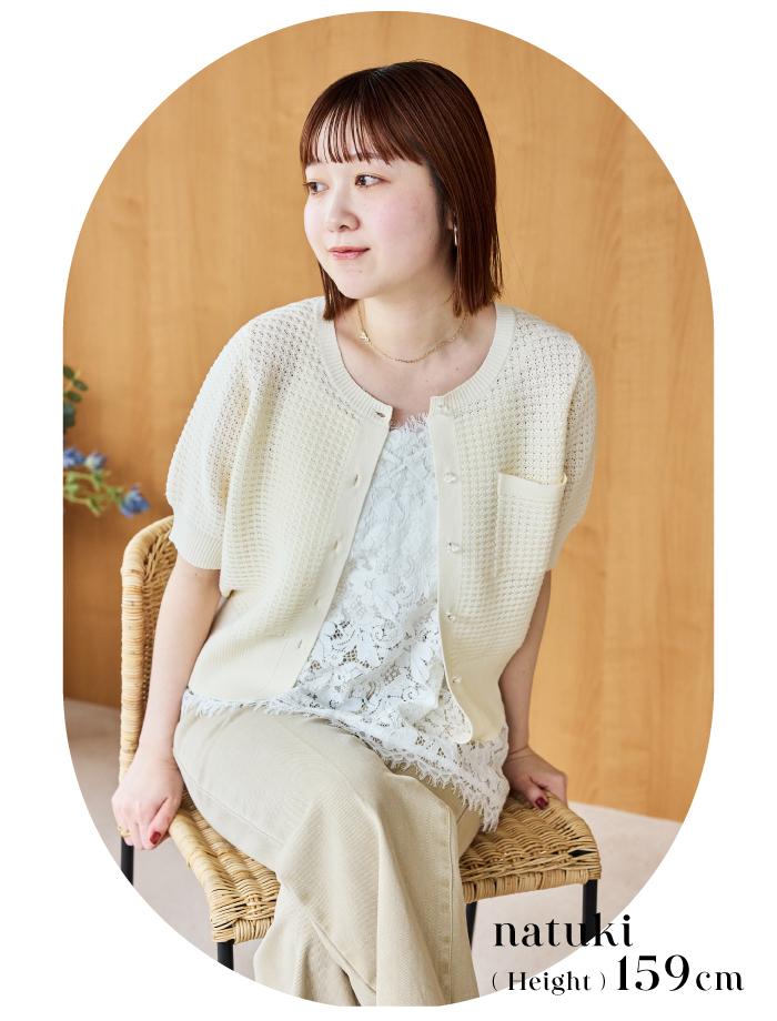 丸みのあるハーフスリーブと、すっきりとした丈感のバランスが絶妙です。ボタンを閉めてプルオーバーのように着るのはもちろん、写真のようにレーストップスを覗かせて羽織れば、こなれたレイヤードスタイルが楽しめます。