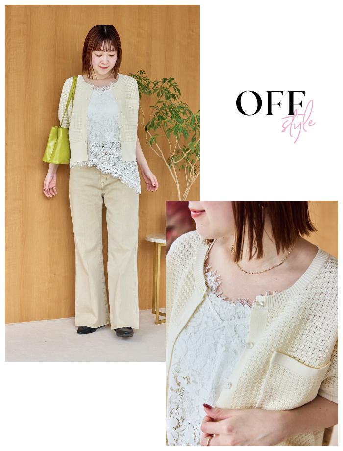 表情豊かなメッシュ編みのカーディガンに、繊細なレーストップスを忍ばせた奥行きのある「オフスタイル」です。全体をエクリュカラーのワントーンでまとめつつ、グリーンのバッグを差し色に加えることで、デニムスタイルをぐっと垢抜けた都会的な印象に格上げします。