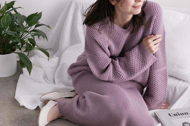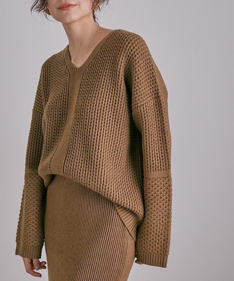 編み地の異なる立体感のあるニットtopsと、リブスカートのセットアップコンビはセパレートでも活躍。