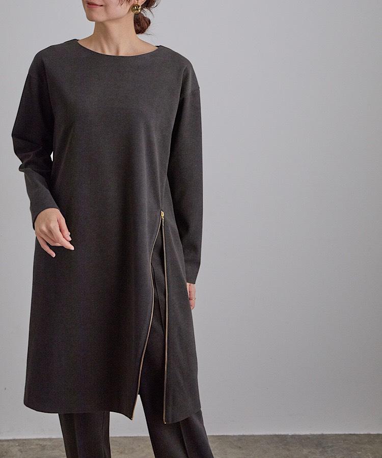 スッキリとしたシルエットのテーパードパンツとフロントジップがアクセントのチュニックで立体的かつ、シルエットを縦長に見せてくれる大人なセットアップです。
