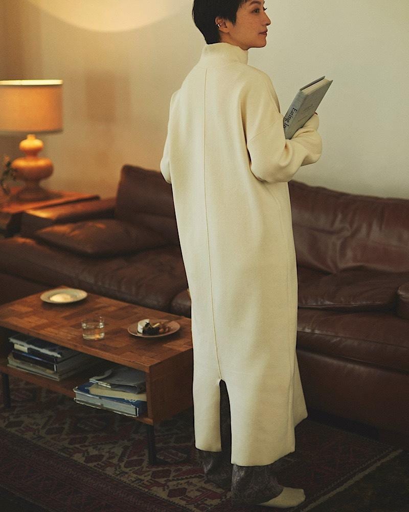 このワンピースはハイネックだから首もあたたか。首元に立体感があるだけできちんと感もあるし、顔移りもあかるくみえますね。」