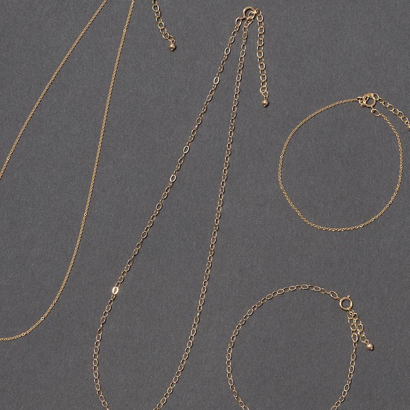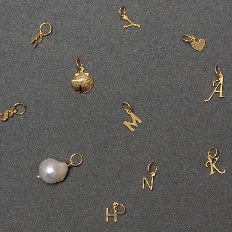 2種類の繊細なチェーン使いに合わせて選べるのは、毎日付けたくなるイニシャルや、ハッピーモチーフとしても人気のハートやシェル。