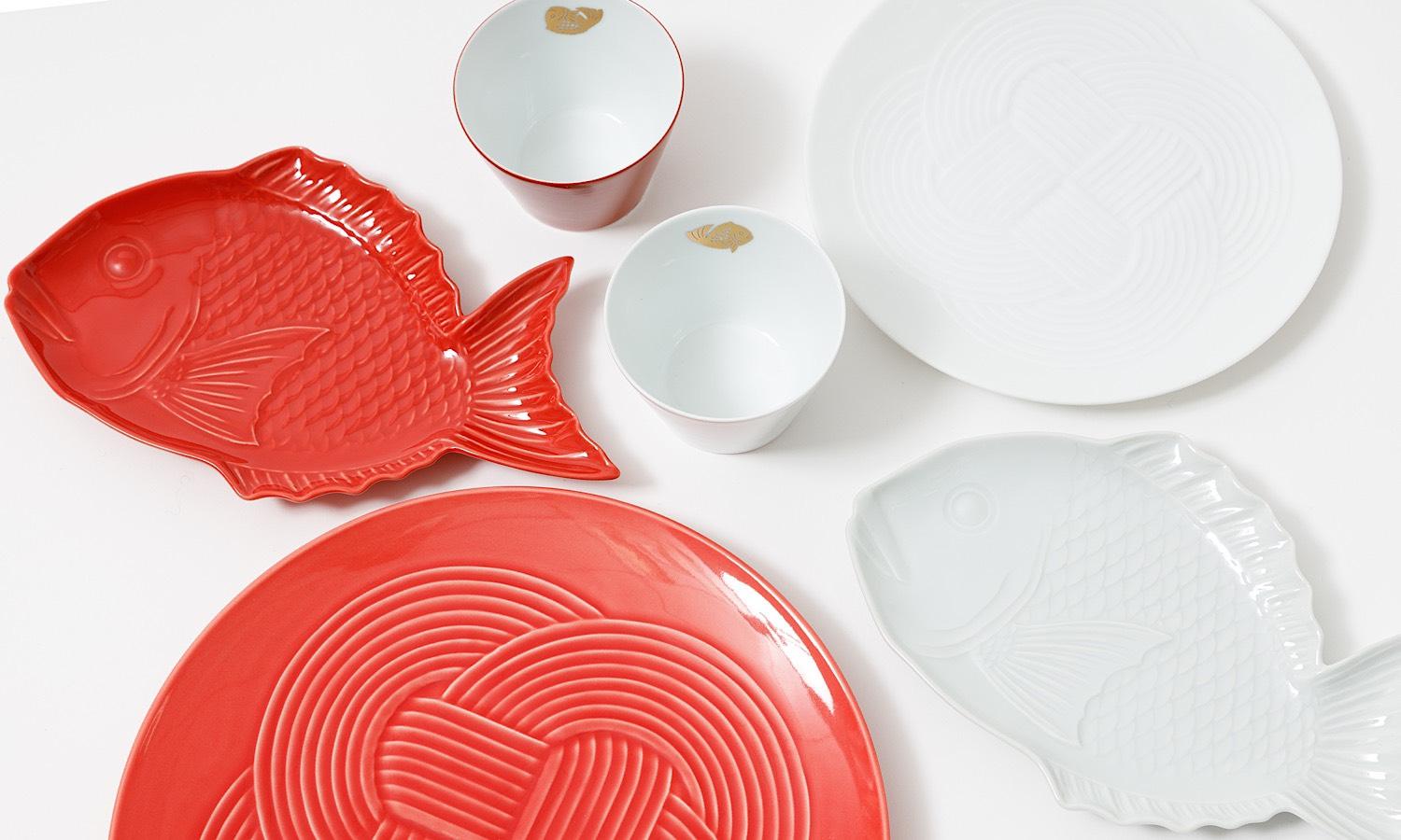 鯛や結びのモチーフと、紅白カラーが特別な日を演出してくれるうつわたち。お正月だけでなく、ハレの日にも活躍するアイテムです。