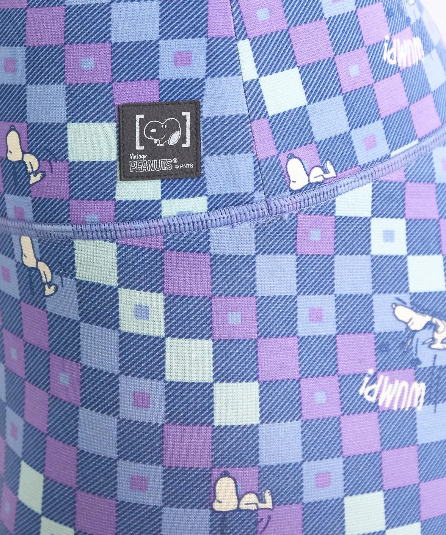 表情豊かなスヌーピーとチェック柄をオンしたタイツ。4方向に伸縮するため動きやすく、吸放湿、防臭効果、断熱効果もすぐれたストレスフリーな素材です。楽しいエクササイズの時間へ。