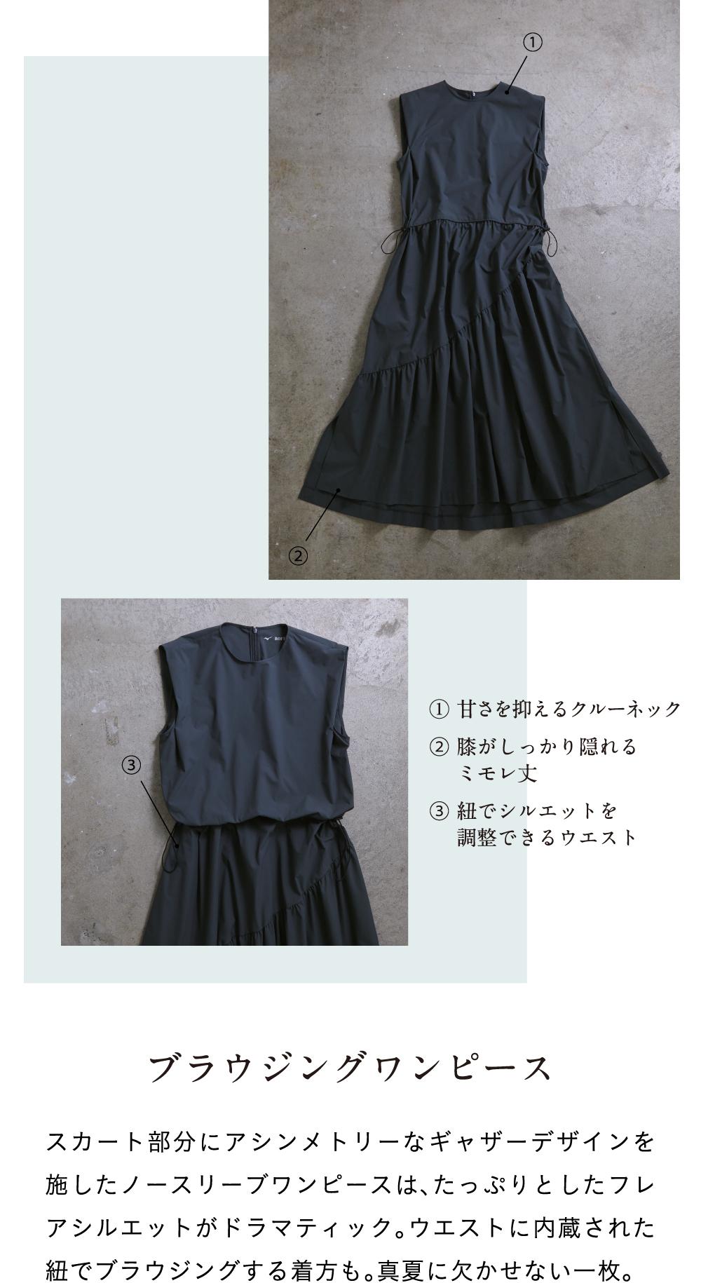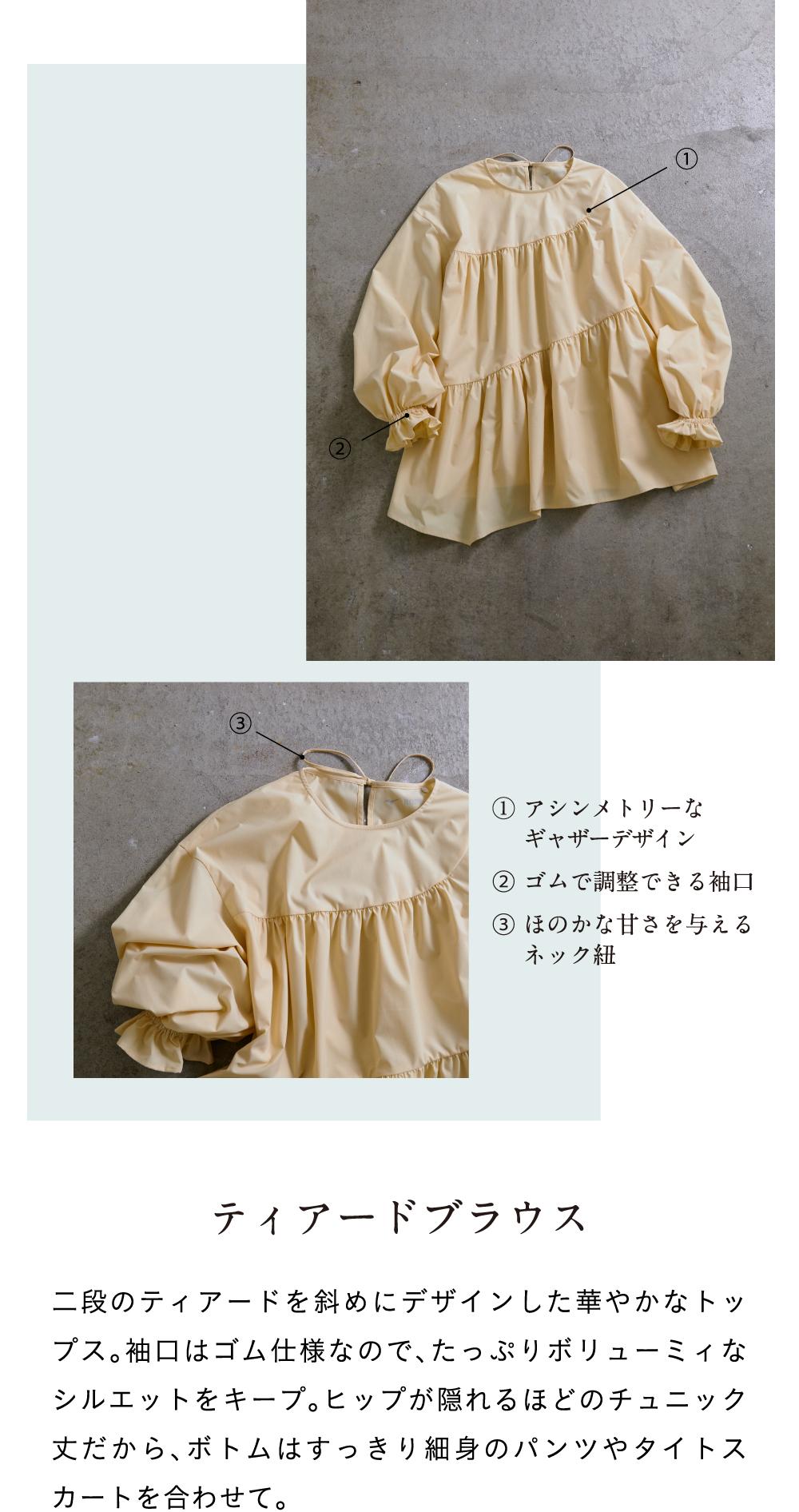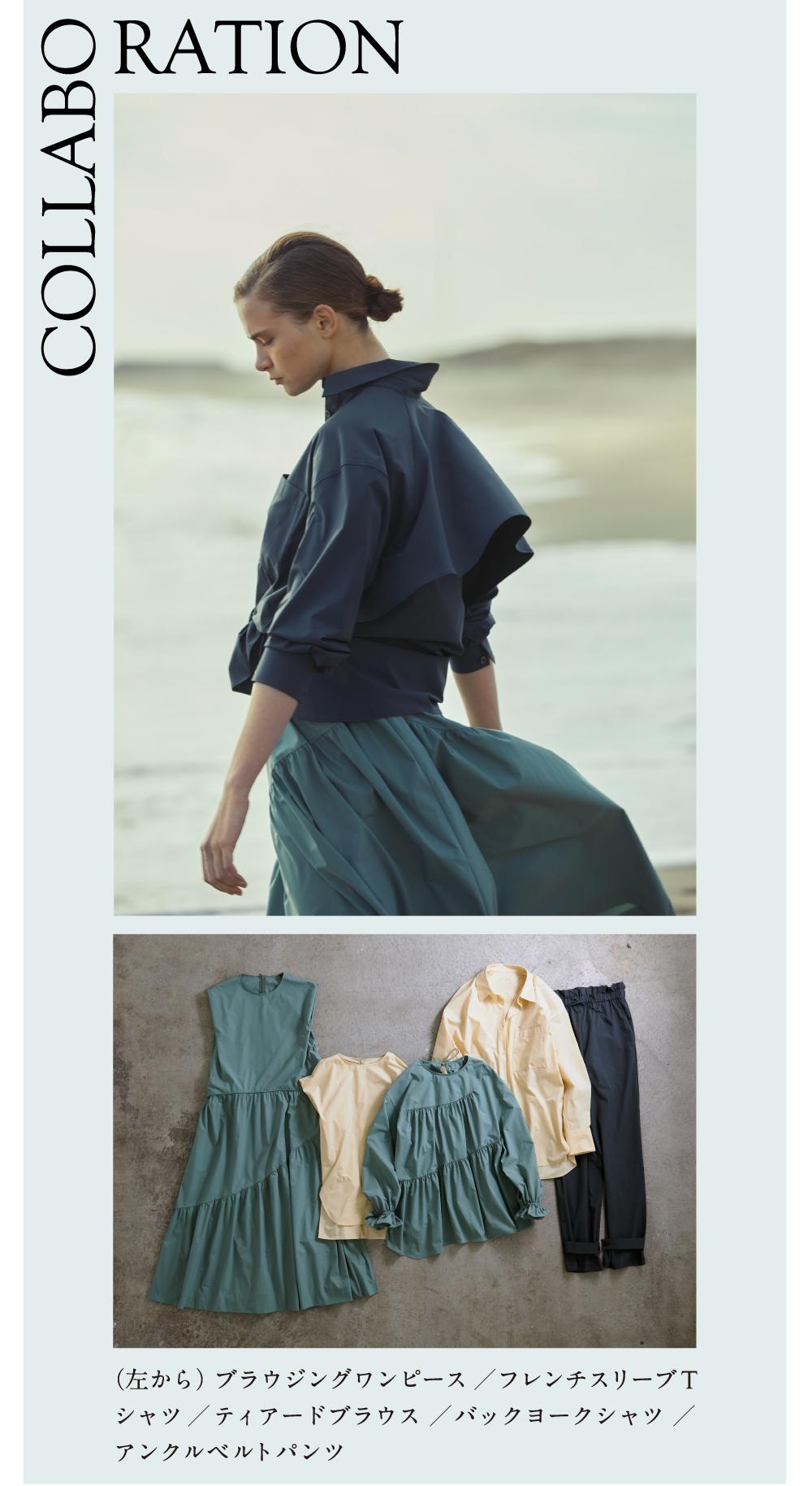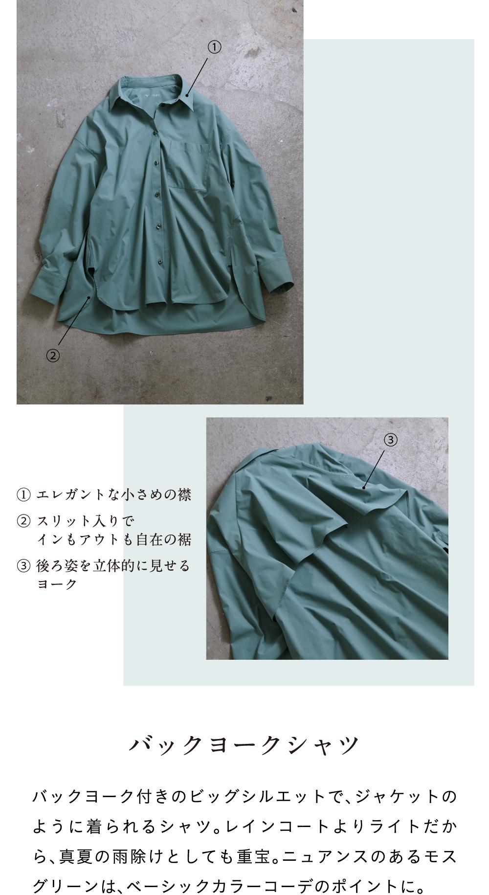 撥水加工やストレッチ、UVカットなど、豊かな機能性とコットン見えする風合いをいかし、エレガントなデザインに着地。