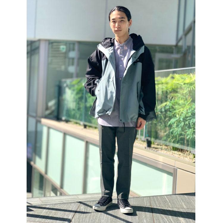 「アウトドアのカジュアルアイテムをスタイリッシュにスタイリング。『GERRY』のマウンテンパーカーに、あえてスラックスやバンドカラーシャツを合わせ、大人な演出をすることで、スポーツ要素をモードに浸透させています」。撥水効果もあるマウンテンパーカーは、テントラインのゆったりとしたサイズ感でデザイン性が高い一枚。ユニセックスで着こなせるので、男女ともに人気のアイテムです。