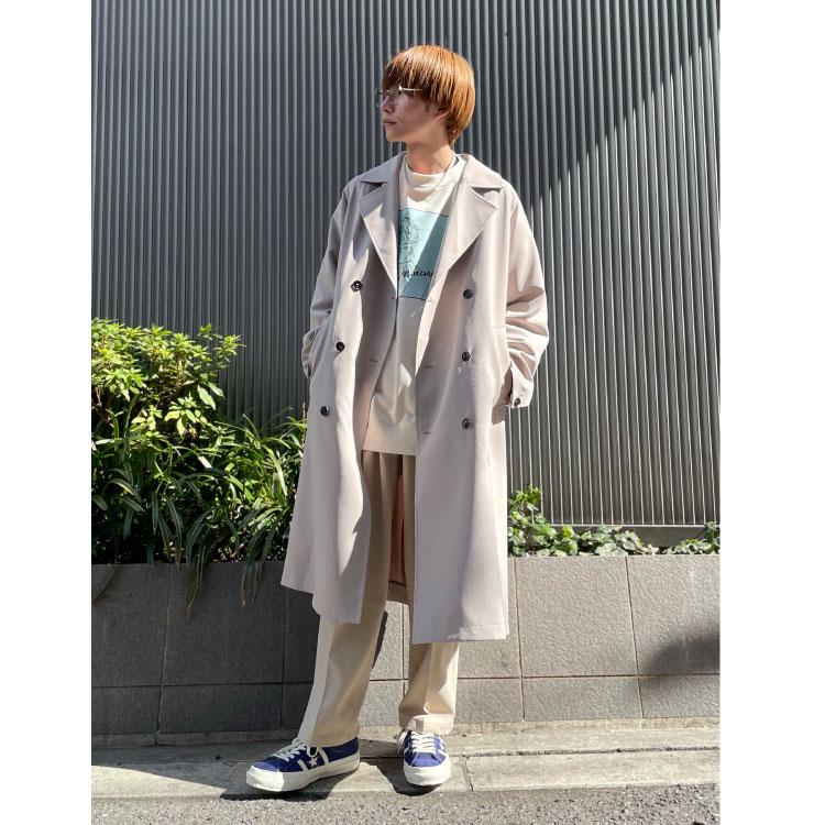 「ストレッチ性もあってなめらかな生地感のコートは、シワになりにくいのも特長。オーバーサイズで着ると、より今っぽい印象です。身長169cmでMサイズを着ると、かなりゆるめでごわつかず、着やすいです。大人っぽいイメージのトレンチコートですが、インナーをスウェット、パンツをワイドシルエットにしてカジュアルダウンすることで、デイリーに着こなせます。春らしく明るいオフベージュカラーで、スタイリングをまとめたところがポイントです!」