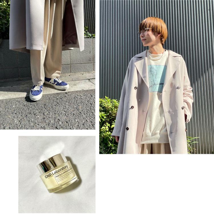 「好きな服、着たい服が、どう着れば自分の体形に合うか? 日々、考えながらファッションを楽しんでいます。 美容面では、背中に届くほどの長髪なので、日々のヘアケアは怠らず行っています」。足元は『BIOTOP』のCONVERSE"JACK PURCELL"別注モデル。初のハイカットで、スラックスにもハマる、人気の一足です。