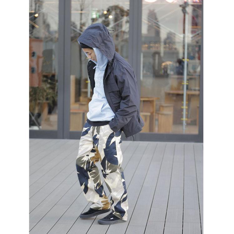 「ライトアウターは、軽量で羽織りにも最適。機能的でデザイン性が高く、収納ポケットもたくさんあります。中にはベストを重ねたり、パーカをあわせたりして、気温差の大きい季節にはレイヤードで着回せるので便利です。パンツのグラフィックがパンチ利いているので、コーディネートのアクセントにしつつ、他アイテムをシンプルに黒で締めてバランス整えた組み合わせにしています。パンツもゆったりめの作りでワンサイズアップし、オーバーサイズで合わせて、Aラインを意識したシルエットにしています」。