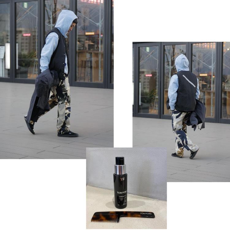 「中綿入りのベストは、シンプルでレイヤードに最適。背中のスラッシュロゴもクールで、ロングシーズン使えます。ゆったりしたサックスブルーのロゴ入りスウェットパーカは、キレイめのコーディネートの差し色にしたり、インナーとして使ったりできます。 おうち美容は…ヒゲ専用のオイルで保湿ケアに日々勤しんでいます」。