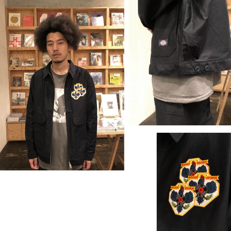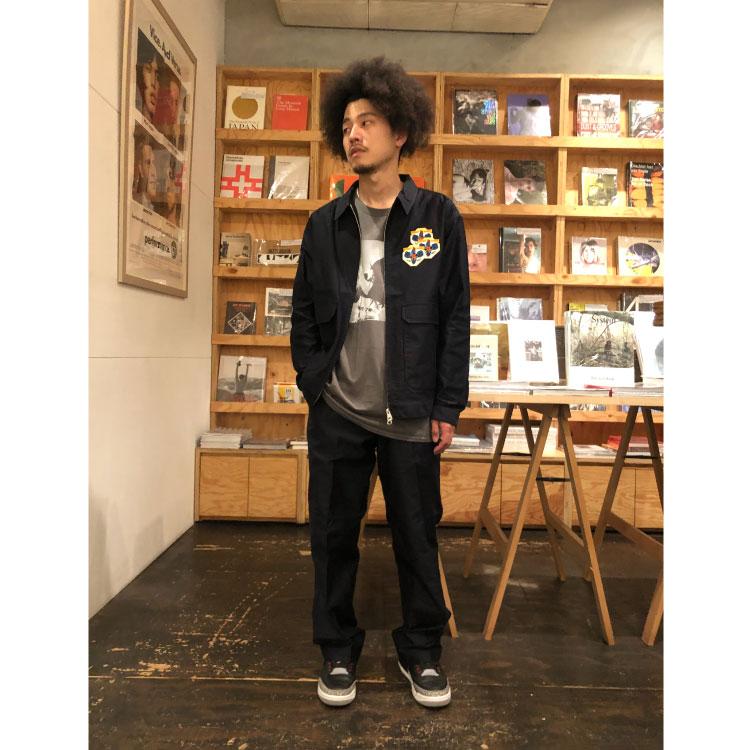 「ディッキーズの代表的なアイテム、アイゼンハワージャケットをベースに、『Bonjour records』が別注したセットアップです。普段さまざまなサイジングを楽しんでいますが、細身の服を着る事が多いです。でも今回のディッキーズコラボに関しては、ワークウェアとしての良さを出すため、普段より1サイズ大きいものを着ました。また、インナーをチラ見せし、レイヤードで普段のこだわりを出しました」。