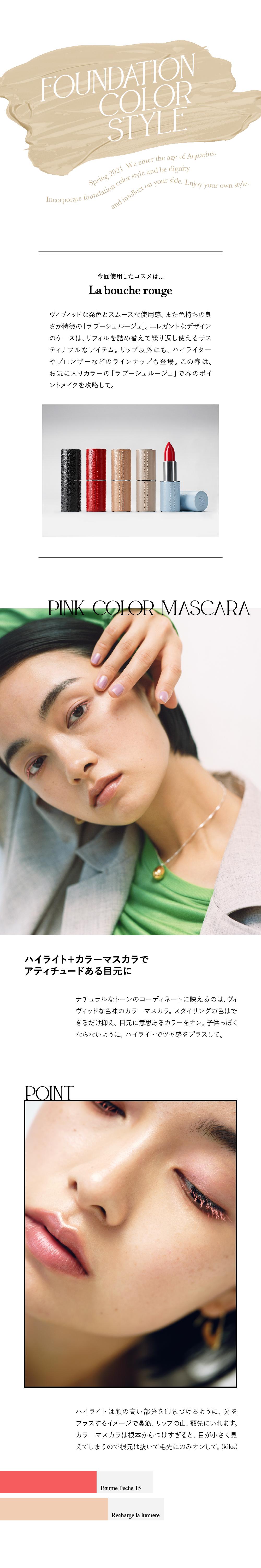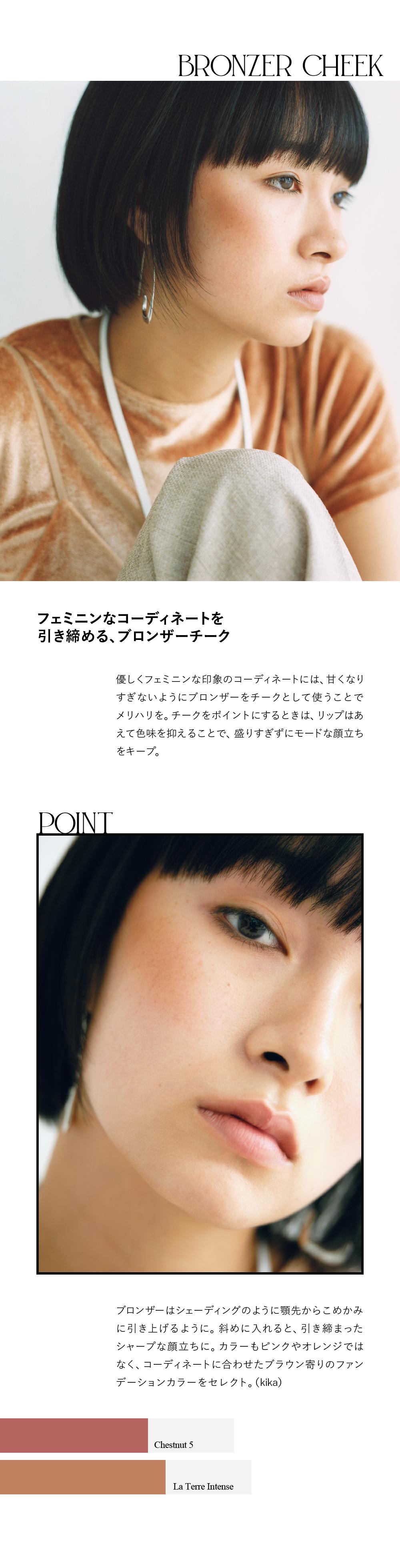 この春ファッションに取り入れたいのは、ファンデーションカラー。クリーム〜ベージュ〜ブラウンと、素肌に馴染む知的で品のあるカラーのアイテムが揃い踏み。そんなファンデーションカラーを着るときのメイクテクニックを、メディアやブランドビジュアルの撮影で活躍するヘアメイクアップkikaさんに伺いました。