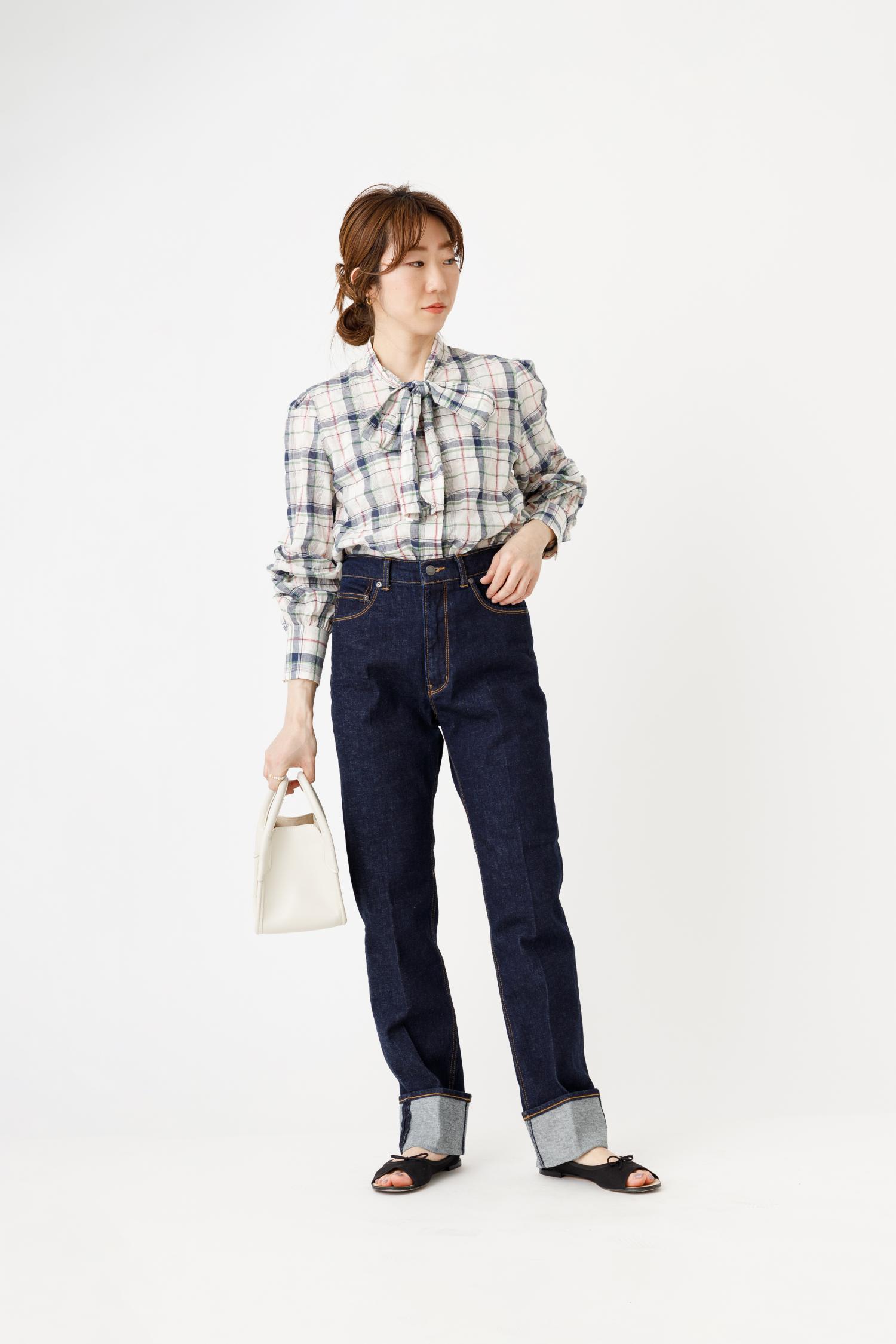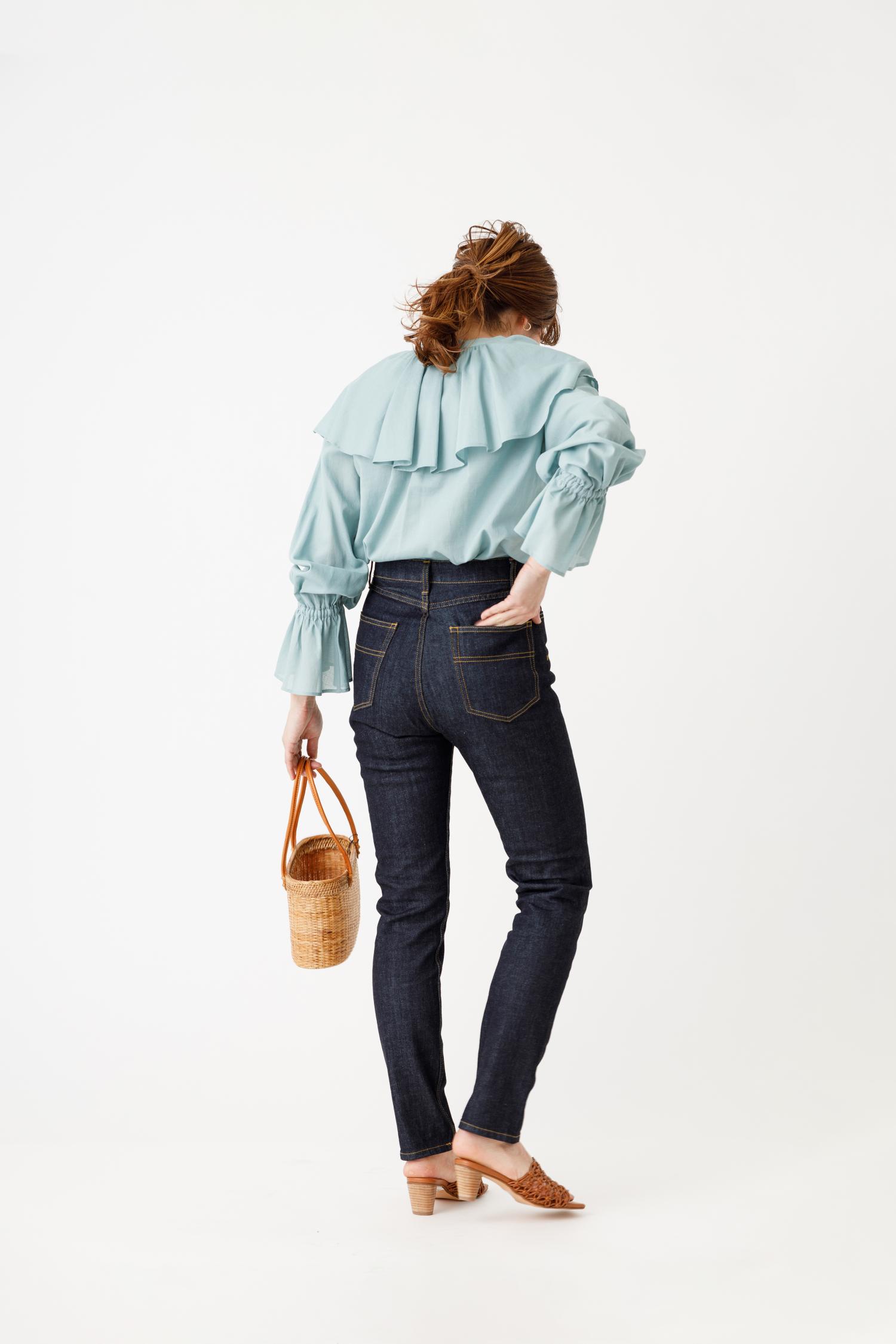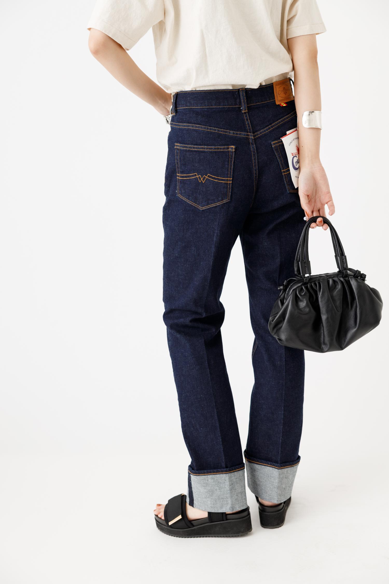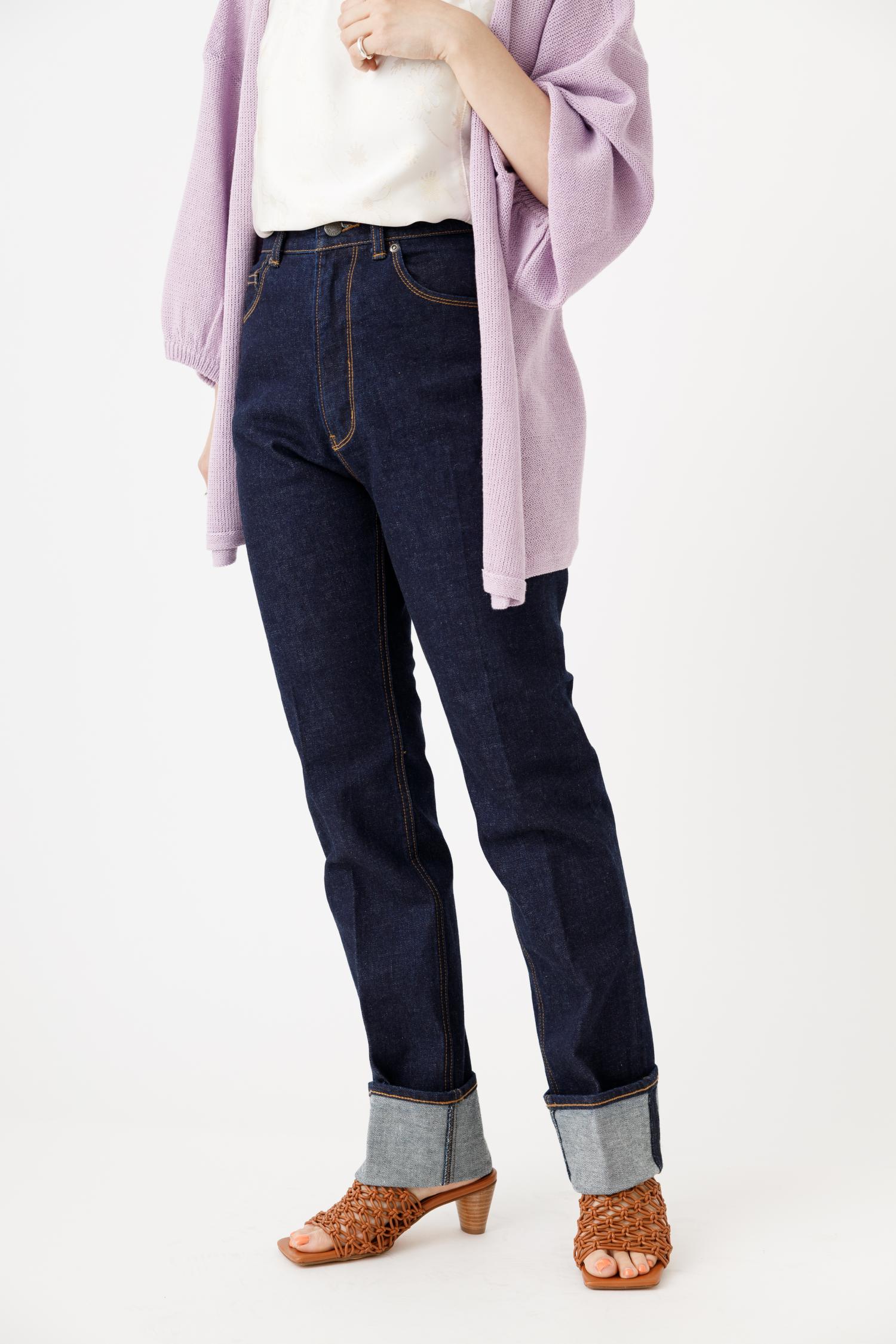 VINTAGEのデニムをベースに、ハイウエスト、センタープレスを施しIラインを強調。 ヒップから裾にかけてのライン、足をしなやかに見せるストレッチ素材など、女性らしいシルエットに拘った仕上がりに。 一枚でもシルエットが美しくおさまる計算されたロールアップのバランス。 シーズンも問わずどんなスタイリングにも合うので、まさに一年中手放せないパンツです。