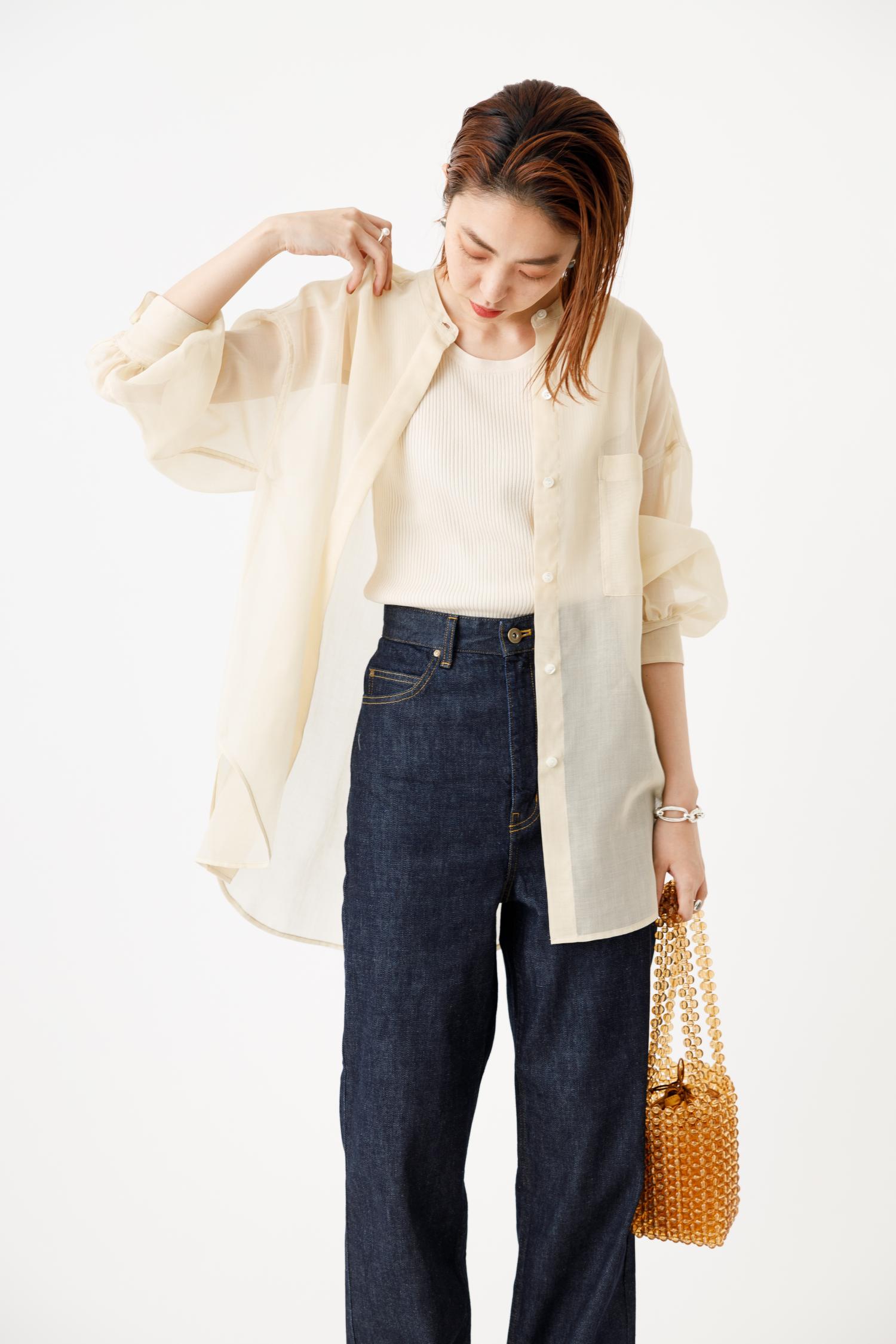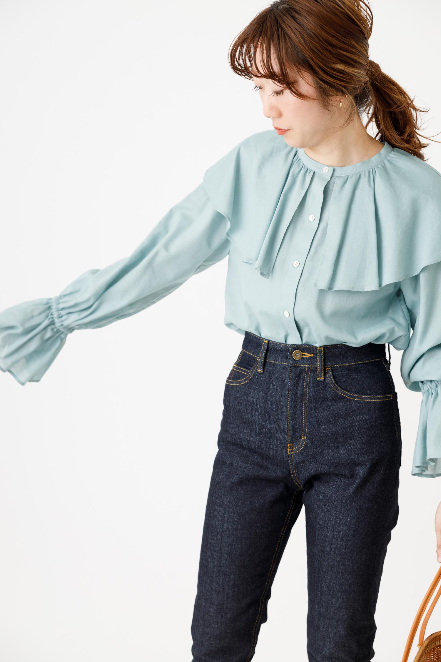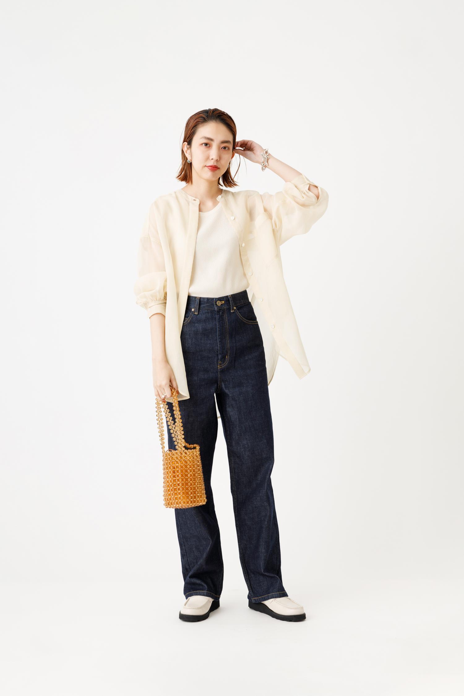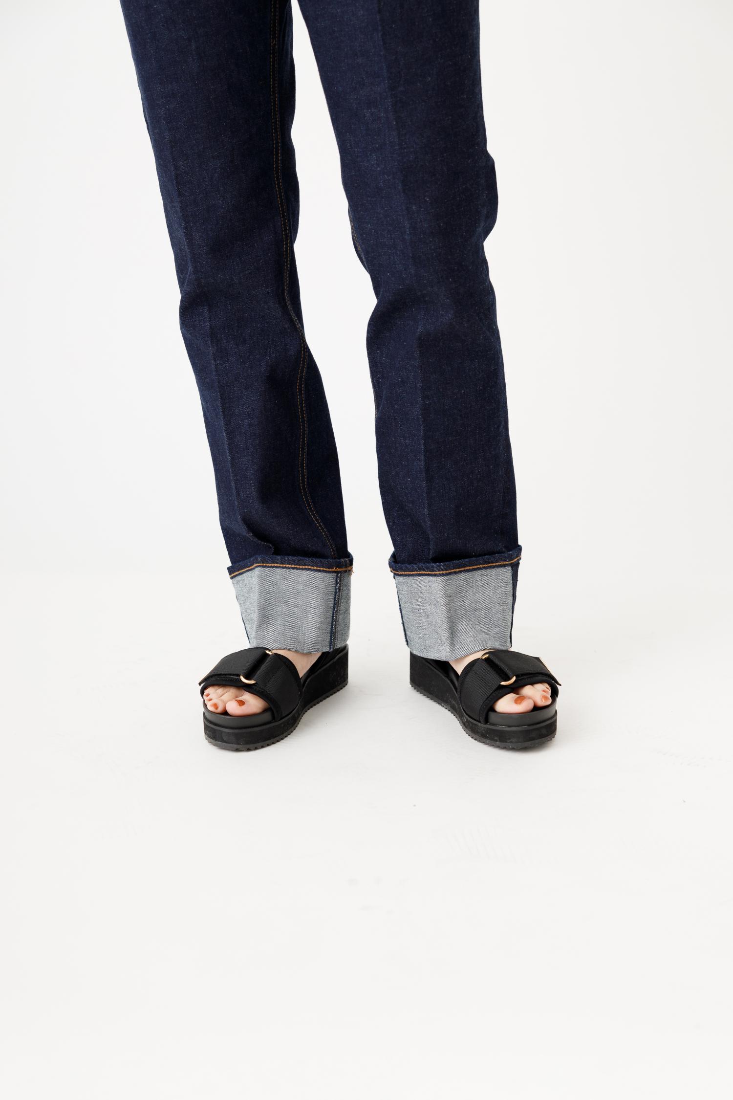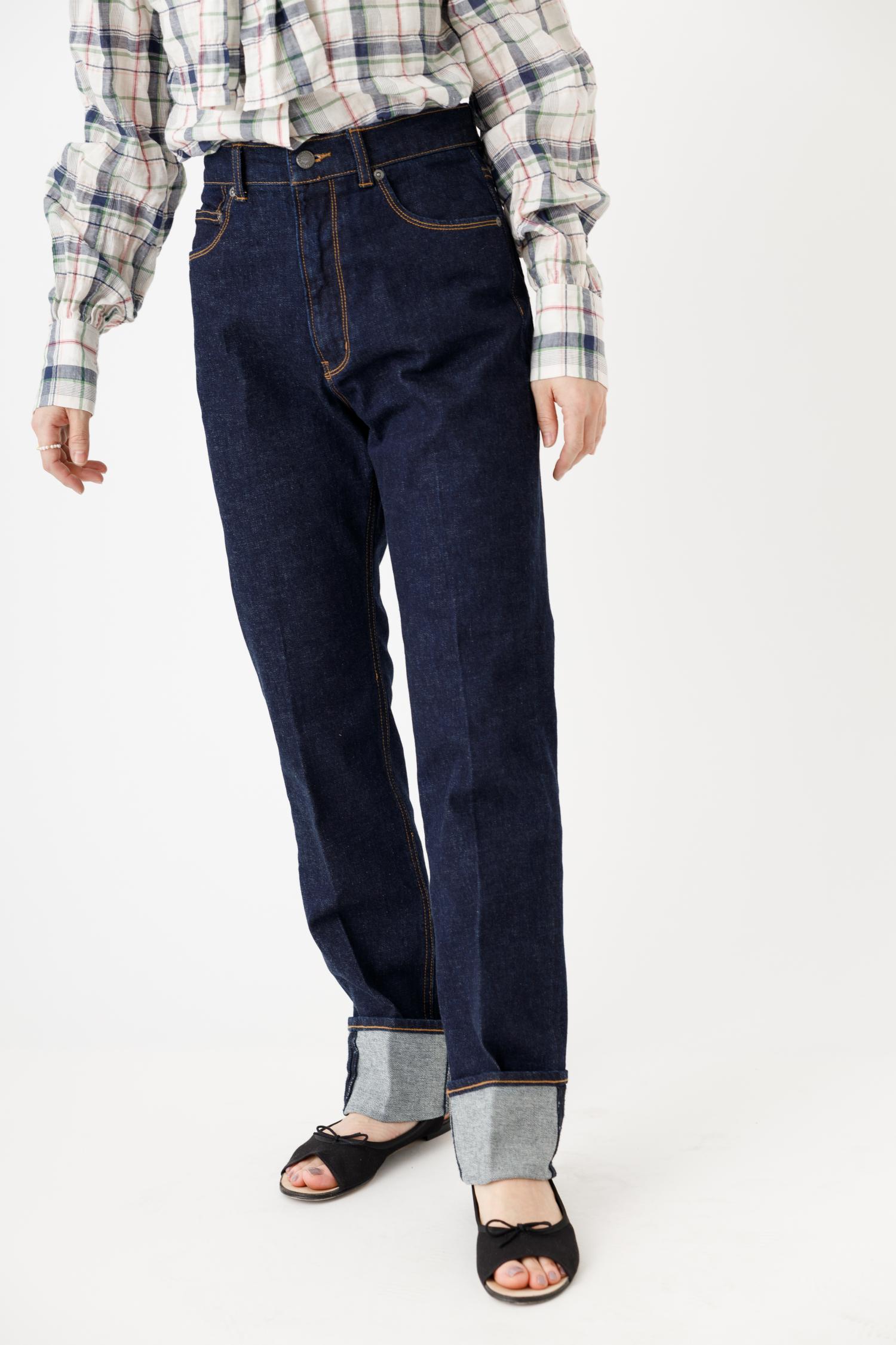 VINTAGEのデニムをベースに、ハイウエスト、センタープレスを施しIラインを強調。 ヒップから裾にかけてのライン、足をしなやかに見せるストレッチ素材など、女性らしいシルエットに拘った仕上がりに。 一枚でもシルエットが美しくおさまる計算されたロールアップのバランス。 シーズンも問わずどんなスタイリングにも合うので、まさに一年中手放せないパンツです。