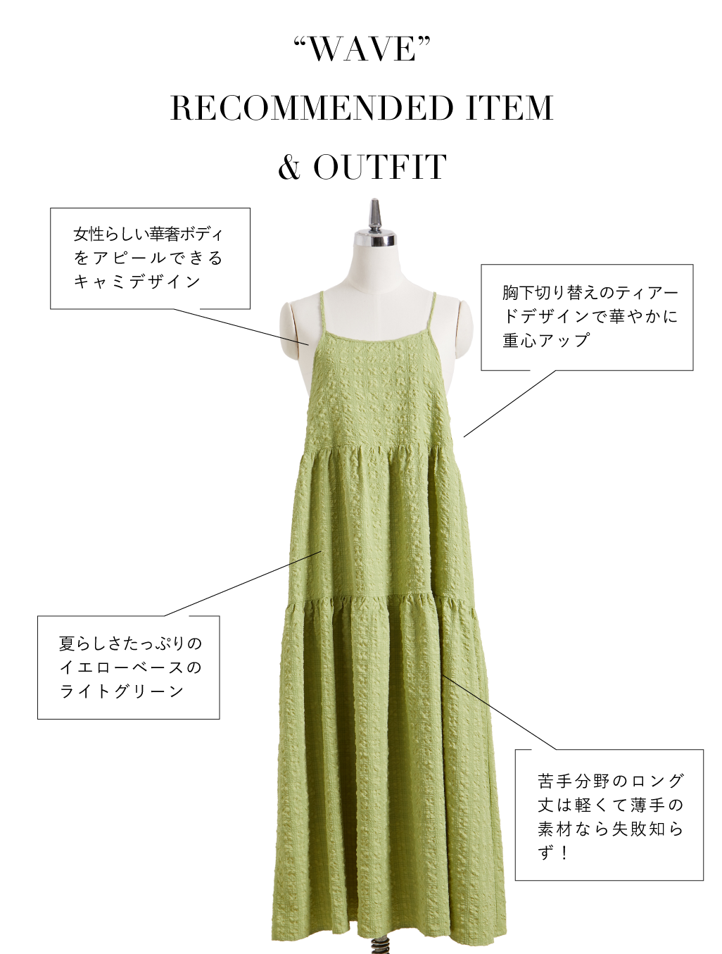 夏らしく軽やかなキャミワンピは、華奢で女性らしい骨格のウェーブタイプだからこそ映えるデザイン。重心アップを意識し、カラーはブラウンやグリーン系をセレクト。