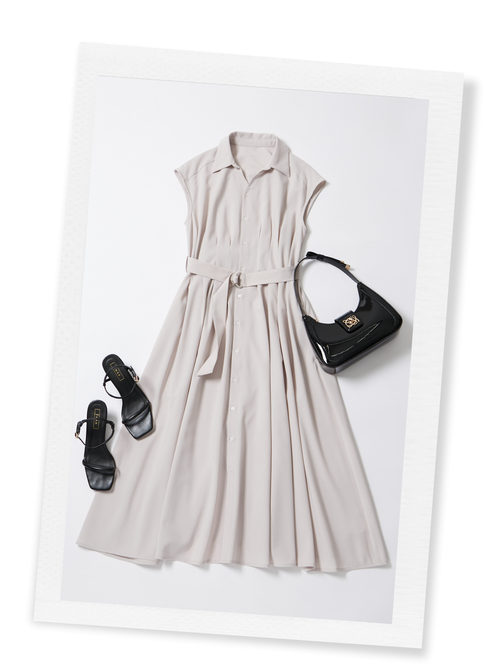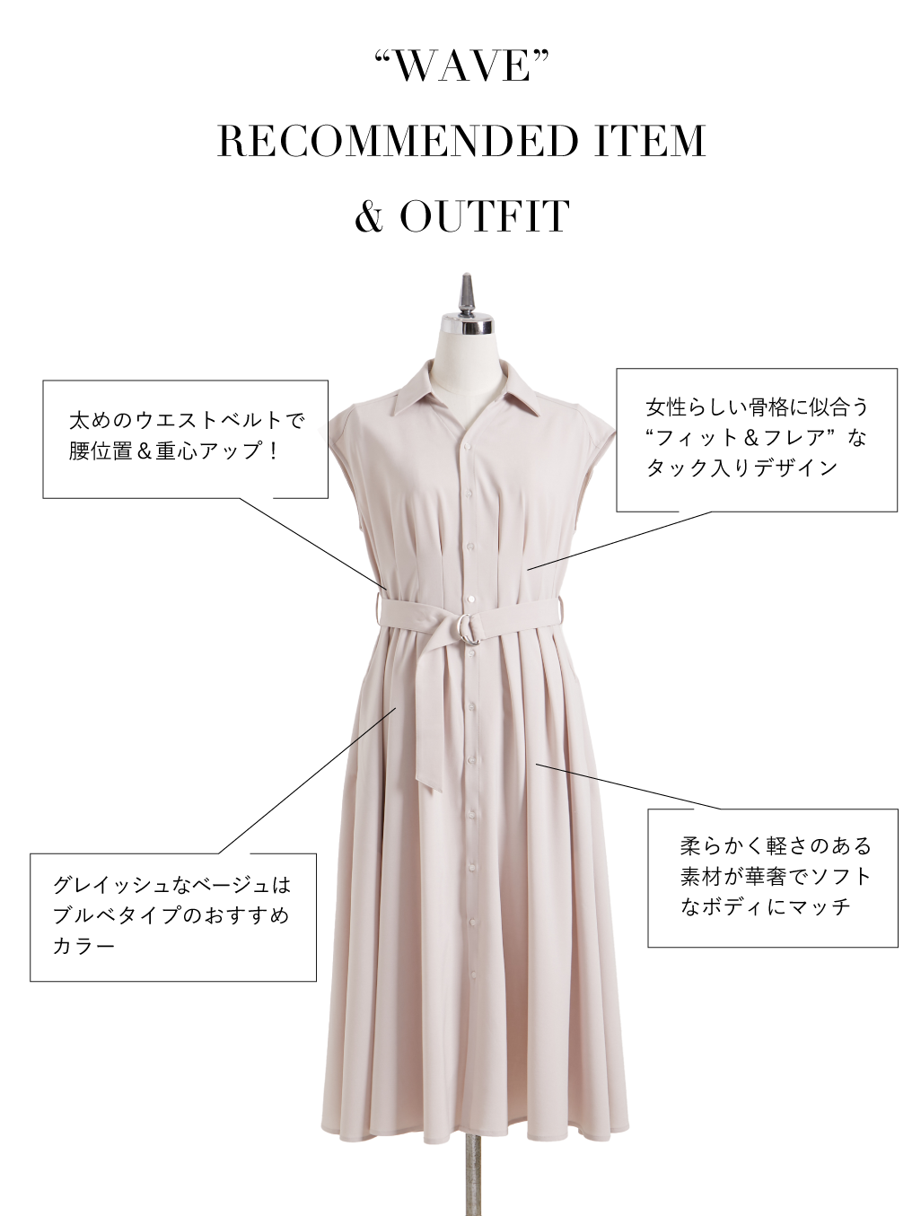 涼しげなムードのベージュのワンピースにブラックを差し、ブルーベースの上品な着こなしに。付属のベルトをキュッと絞ることで、ウェーブタイプ特有のウエストのくびれをしっかりアピール。下にある重心を高め、スタイルアップしてくれます。ブラックの小物は主張しすぎない華奢なものが最適。