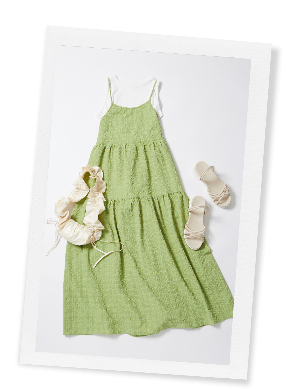 下重心で華奢ボディが特徴のウェーブタイプは、インナーはコンパクトなタンクトップがおすすめ。胸元が寂しく見えないよう、ストラップは短めに調節し、胸下のティアード切り替えでウエスト位置を高めて。小物はイエベ肌やグリーンとも相性のいいアイボリー系で統一。華やかなフリルで女性らしく。