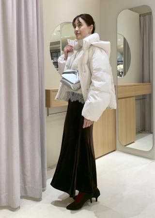 やわらかな質感をもっているので、身につけるものも薄手でやわらかな質感、装飾のあるデザインをセレクト。また寂しい印象にならないよう、足し算スタイルも必須。