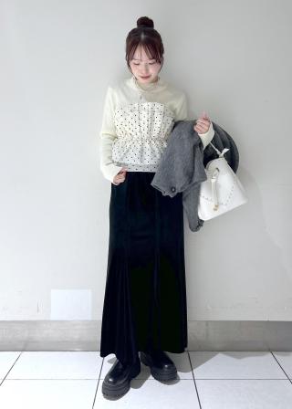 やわらかな質感をもっているので、身につけるものも薄手でやわらかな質感、装飾のあるデザインをセレクト。また寂しい印象にならないよう、足し算スタイルも必須。