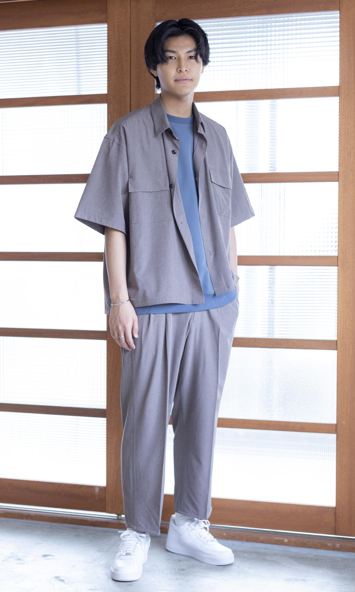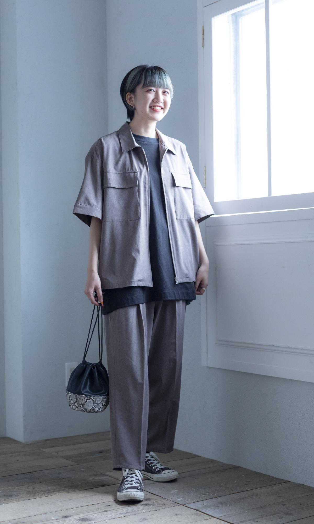 ボトムと色の違うAIRDRYモンスタービッグシャツの中に、更に大きなシルエットのTシャツを着て袖と裾からレイヤードさせた他と被らない1クセあるコーデ。