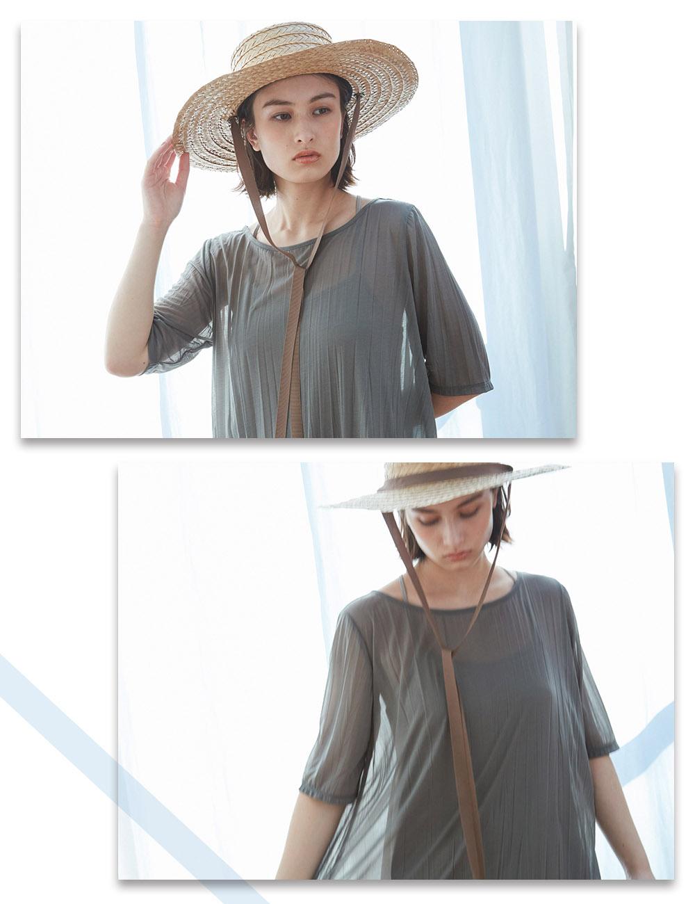 肌触りもよい、見た目も涼しげな天竺素材は、ワッシャー加工でナチュラルな表情を持たせています。適度な透け感があると共に、着ているときのシワを気にせずに使えるのも便利。肌の透け方も自然で上品なので、天然素材系の小物やサンダルなどとの相性も良く、夏中楽しんで着こなせます。