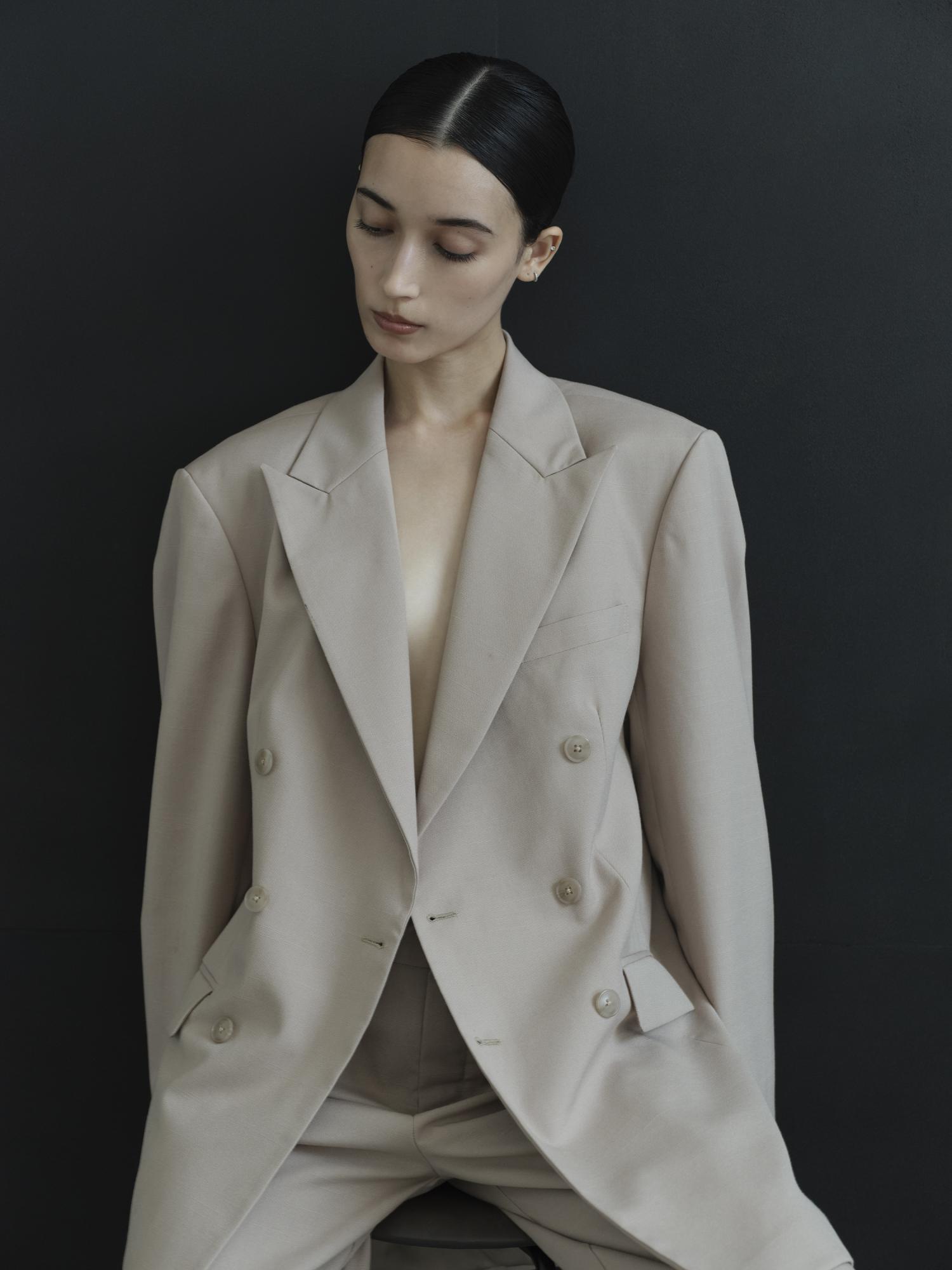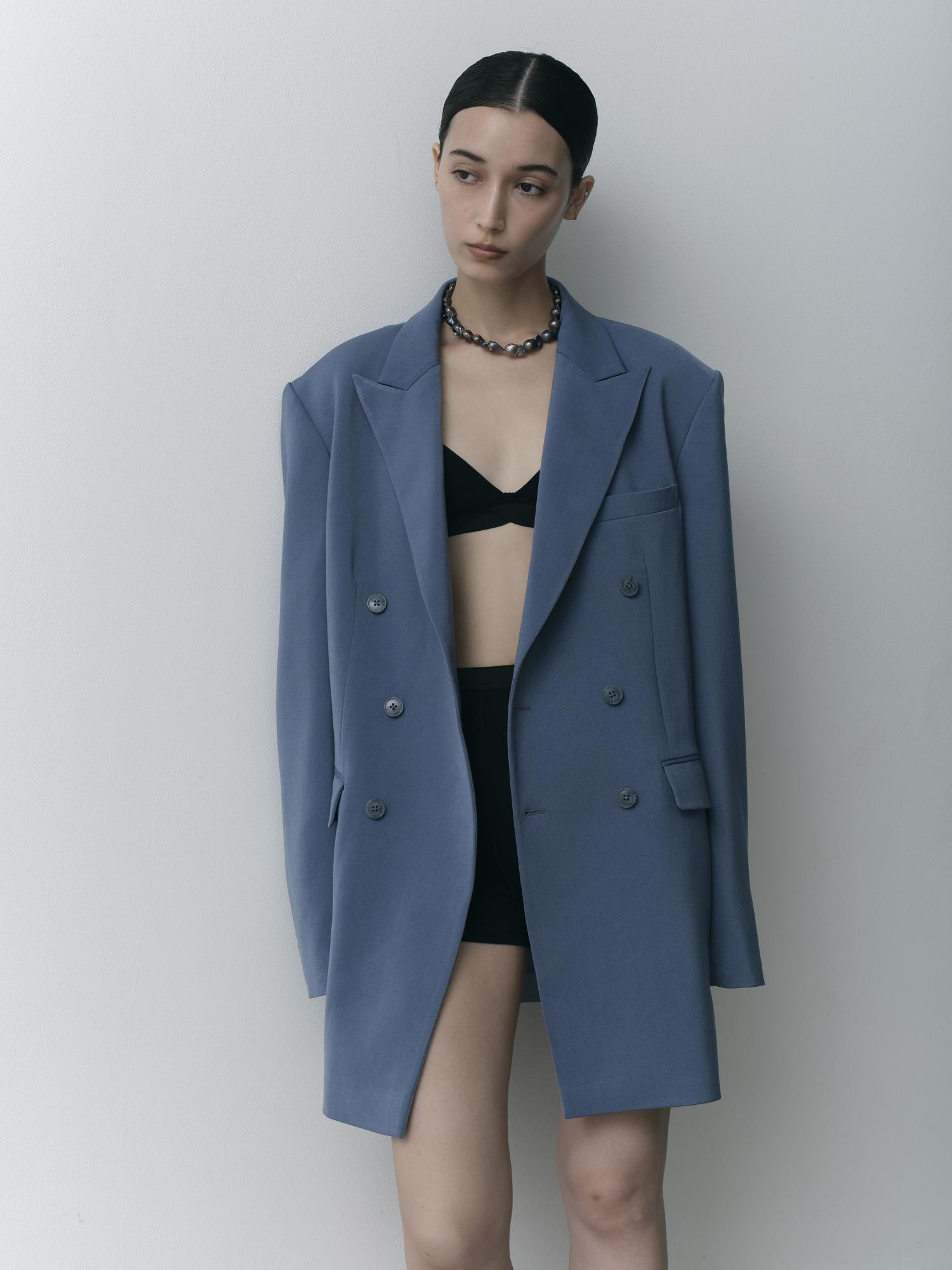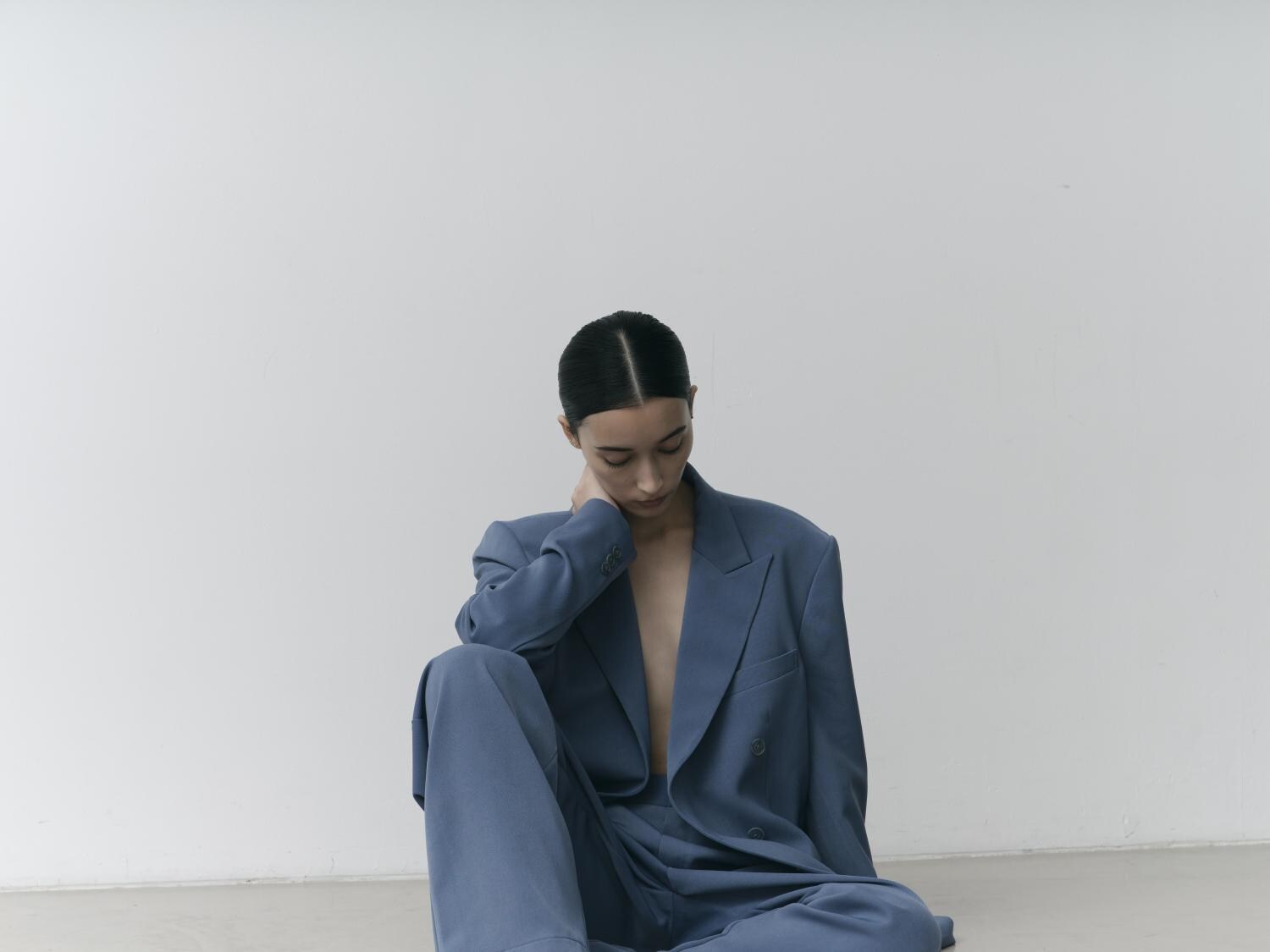 夜明けの空を纏うような、グレイッシュブルーのジャケットとパンツのセットアップが登場。