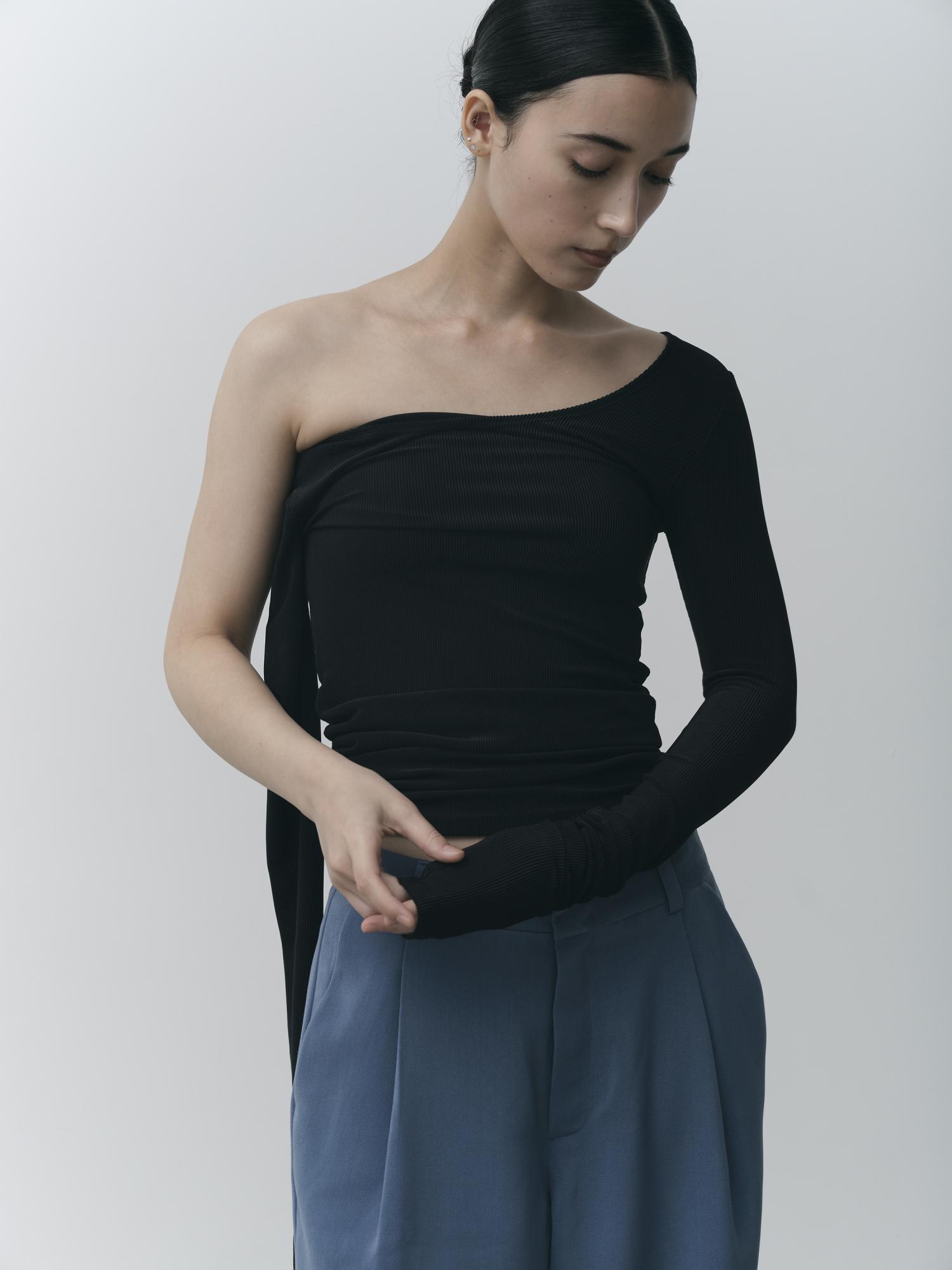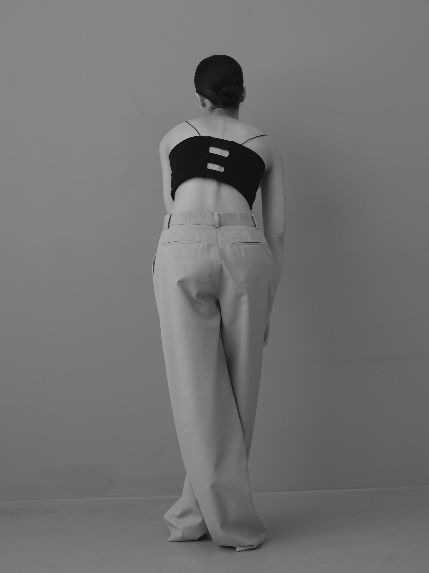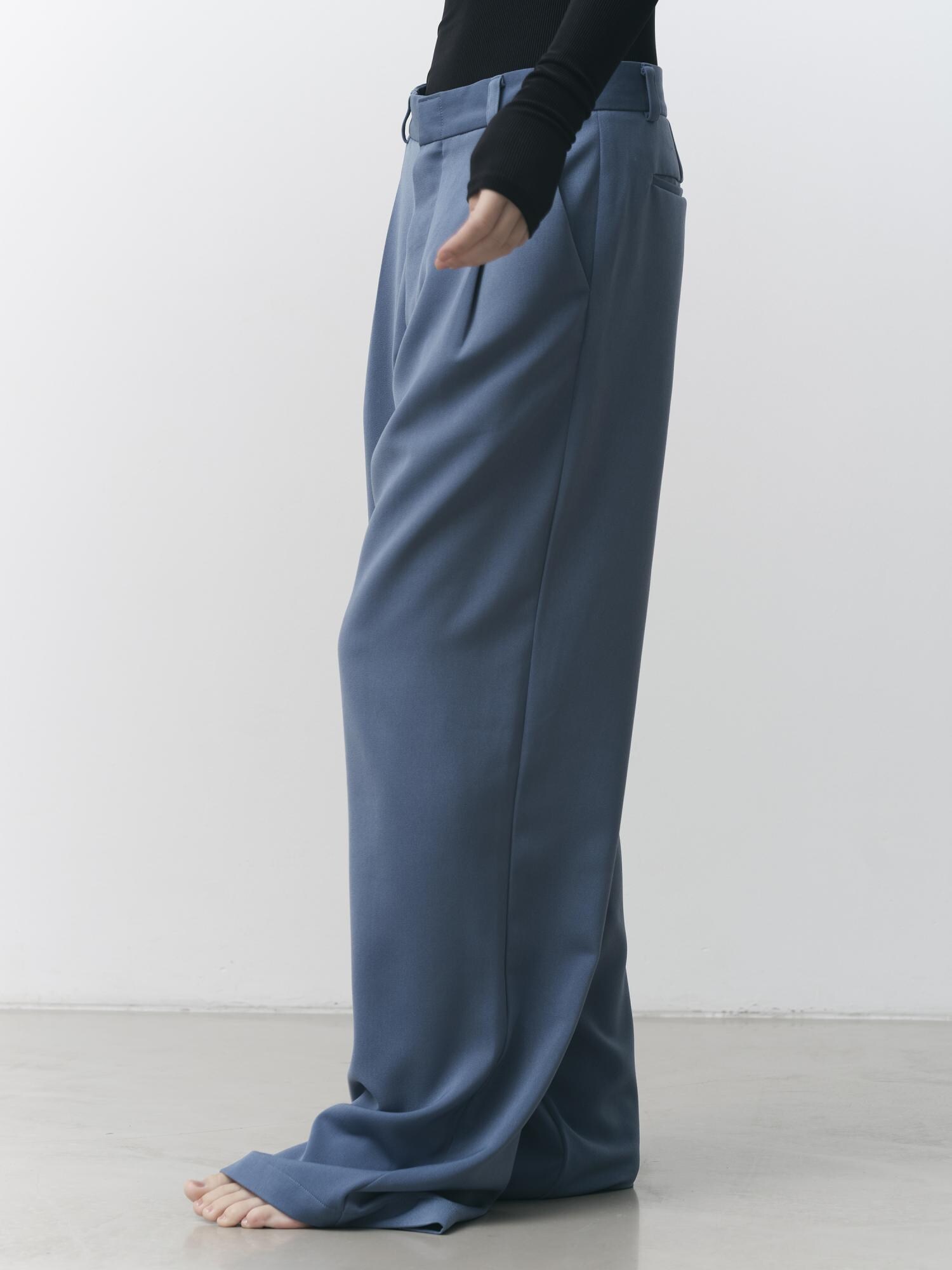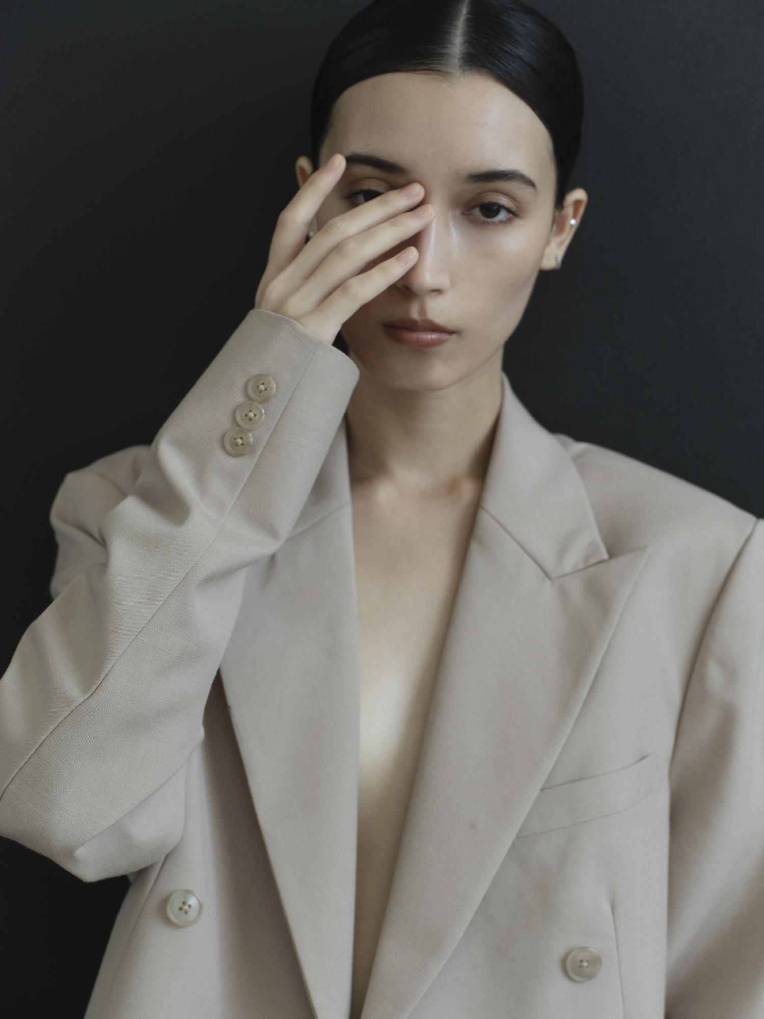夜明けの空を纏うような、グレイッシュブルーのジャケットとパンツのセットアップが登場。