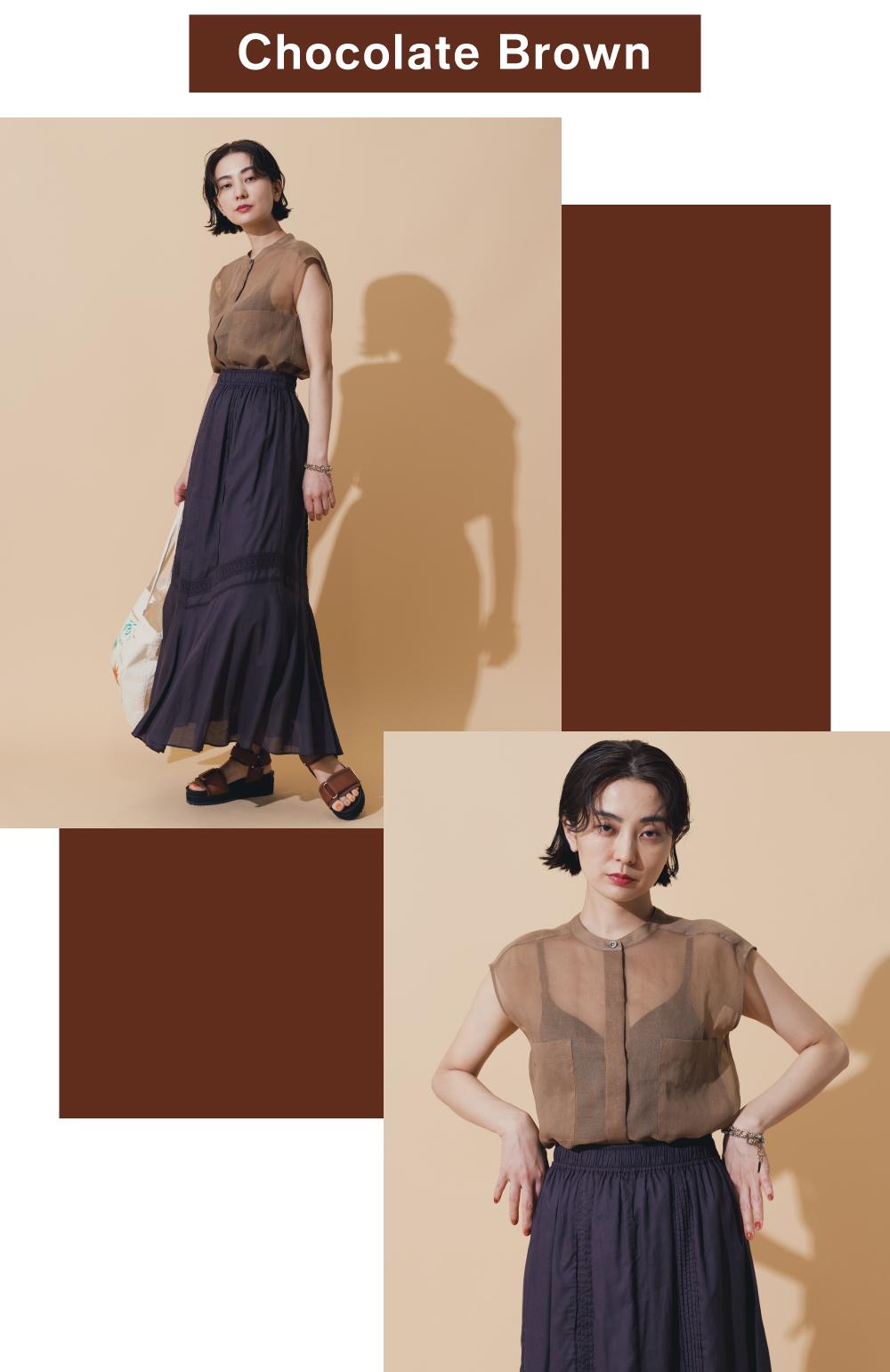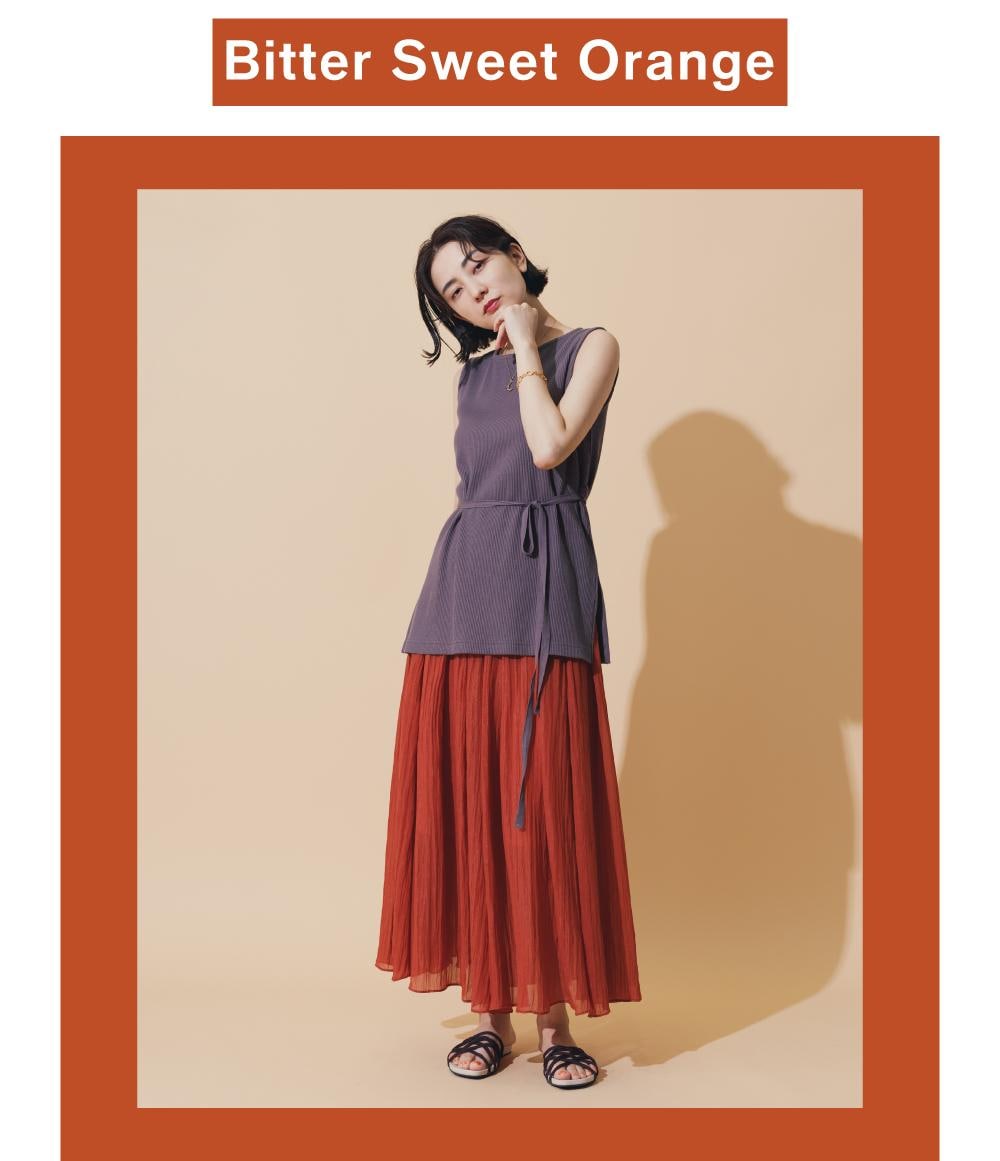 アースカラーや深いキレイ色の、明度を落としたトーンで夏の軽装をアップデート。