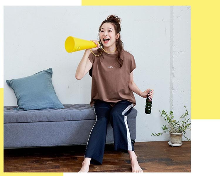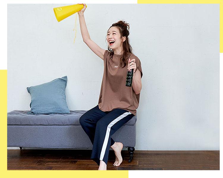ビッグシルエットT&テーパードパンツスタイルで、自宅でも取り組みやすい筋トレやストレッチなど行いながらの応援にもおすすめです。