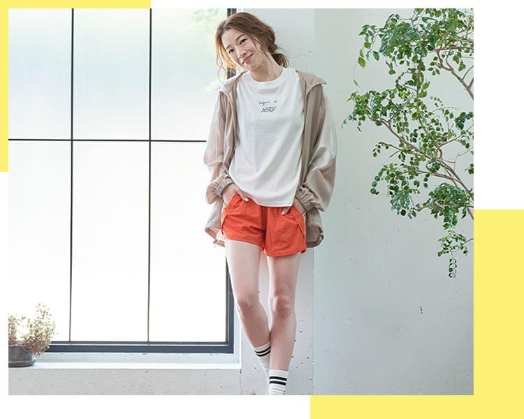 シボサテン素材のラインパンツはラグジュアリーさとスポーティーのMIXが魅力。気付いた時に始められる気軽さが嬉しい、UV・接触冷感機能付きテーパードパンツとビタミンカラーのランニングパンツ。