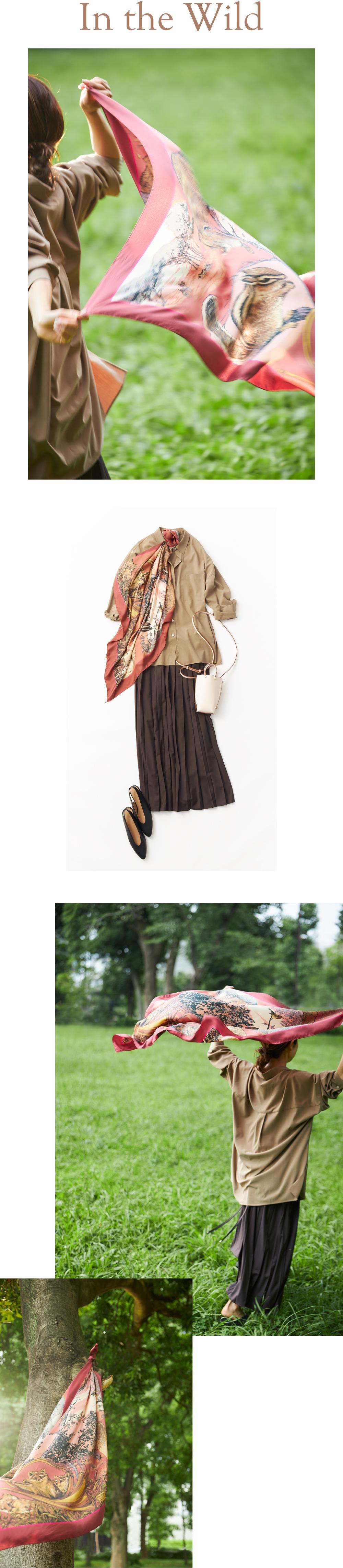 アレンジがしやすいのにシワになりにくいのが魅力の10.5匁のシルクツイルスカーフは、毎年新柄を楽しみにお待ちいただくお客さまも多くおられます。