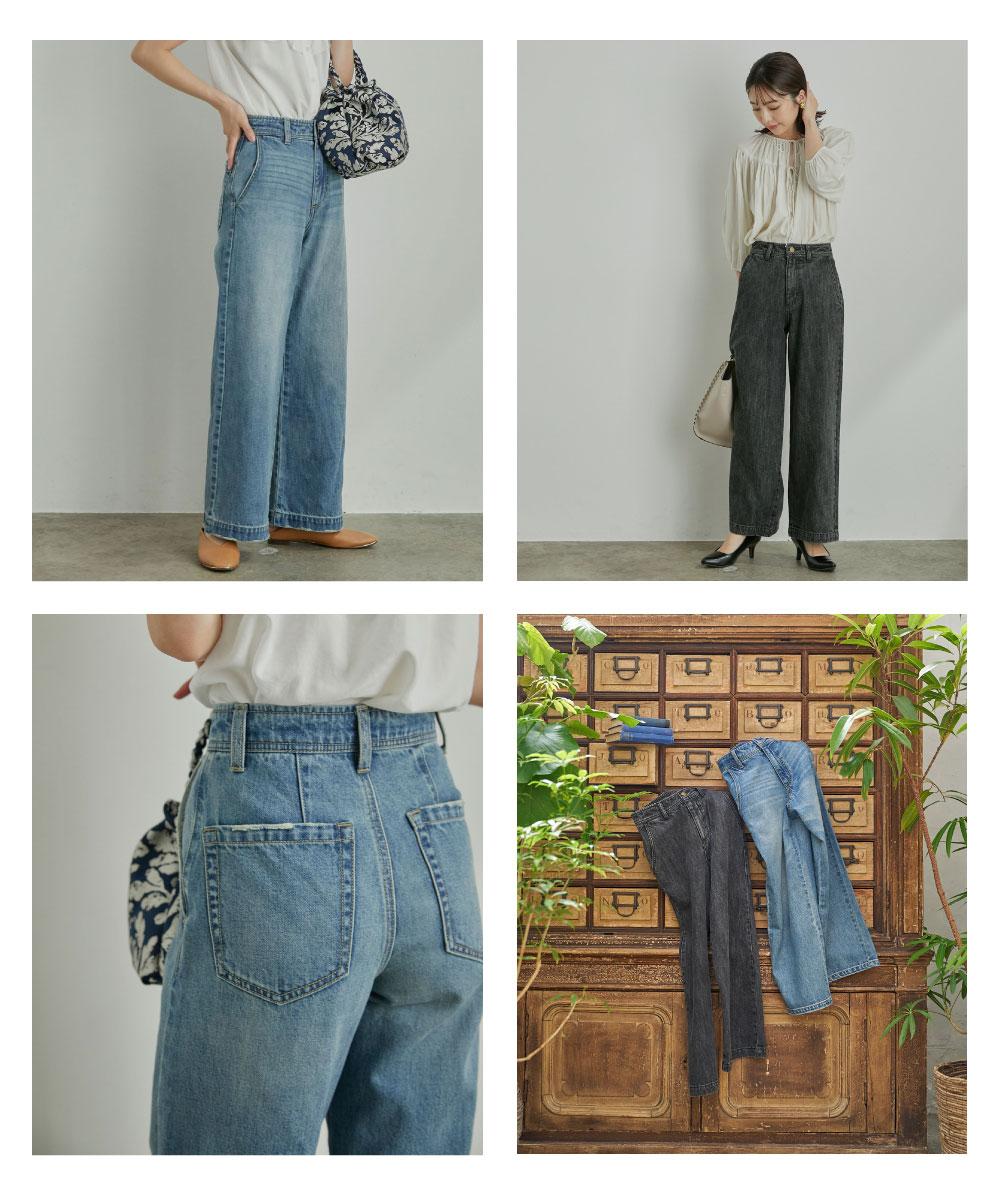デニムだけどスラックス見えするポケットのデザインや、ウエストがすっきり見えるカーブベルト、ヒップ位置が高く脚が長く見えるシルエットなど、シンプルですが様々な部分にこだわりのあるデニムパンツに仕上げています。