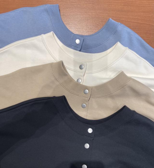 秋の新作のご紹介です。 連打されたスナップボタンが可愛いカーデガンです。 着丈が短いので、ちょっと若いイメージですが、ボタンを外して羽織っていただくと大人の女性にもぴったり。 袖はトレンドのボリュームスリーブで、クシャっとまくっても決まるので、秋の初めに大活躍してくれそうです! 前後2wayでコーディネートを楽しめるアイテムです。 ぜひお好みのカラーを見つけにいらして下さい。