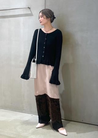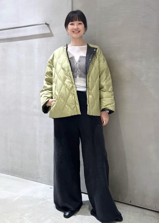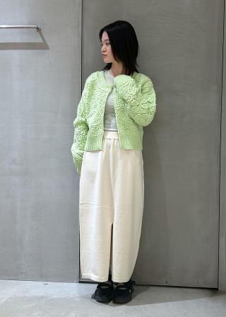 季節に合わせて、ニットやTシャツを選んでいただいたり、ローゲージカーディガンを羽織ったりと、幅広い合わせが出来る一着です。