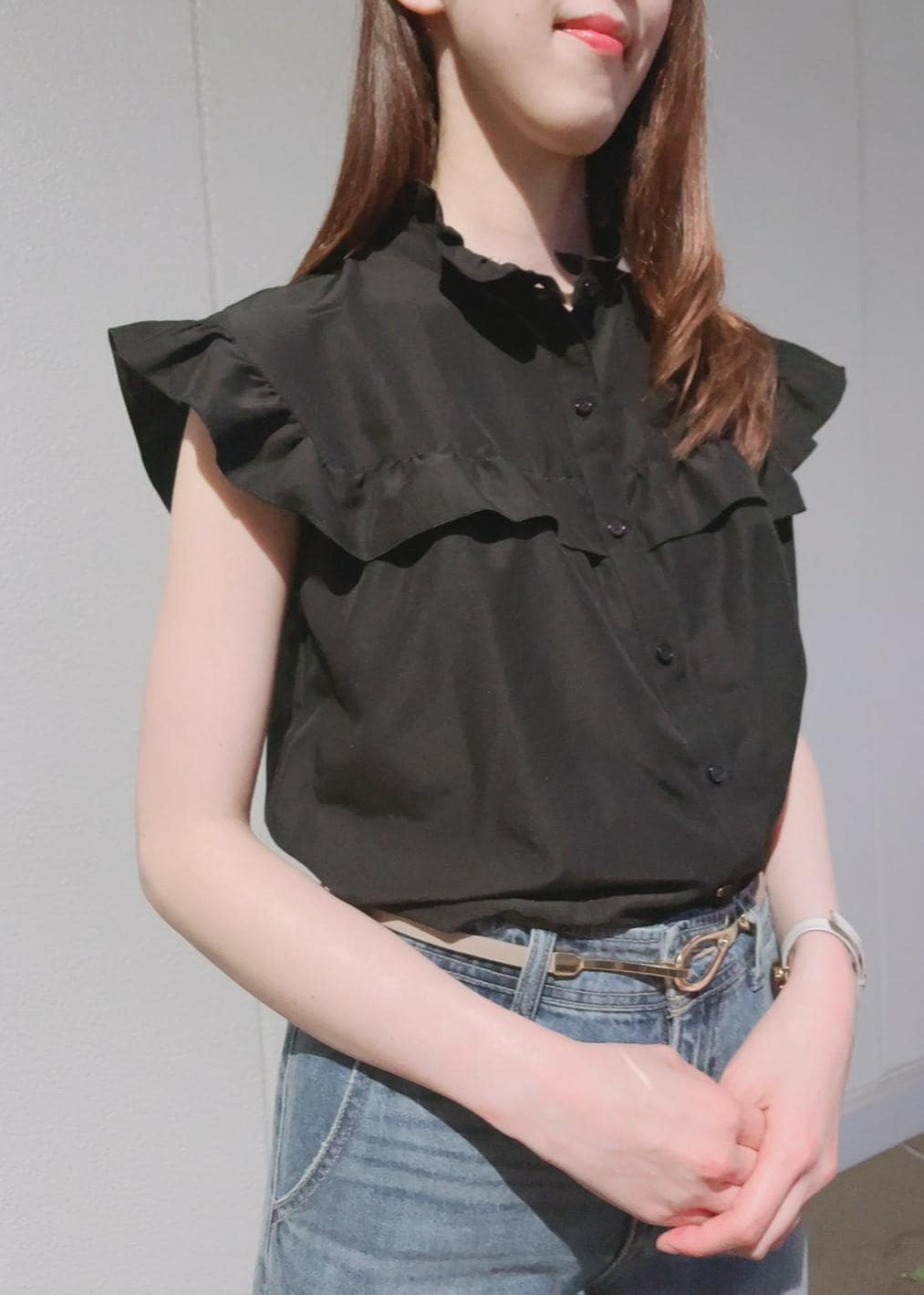 甘さのあるフリルブラウスはブラックを選べば甘さを抑え目にみせてくれます。 デニムのバギーパンツと合わせてカジュアルダウンし、脚長効果でスタイルアップです。