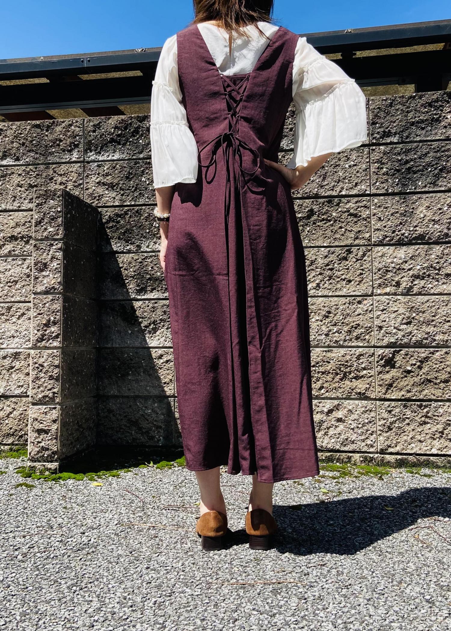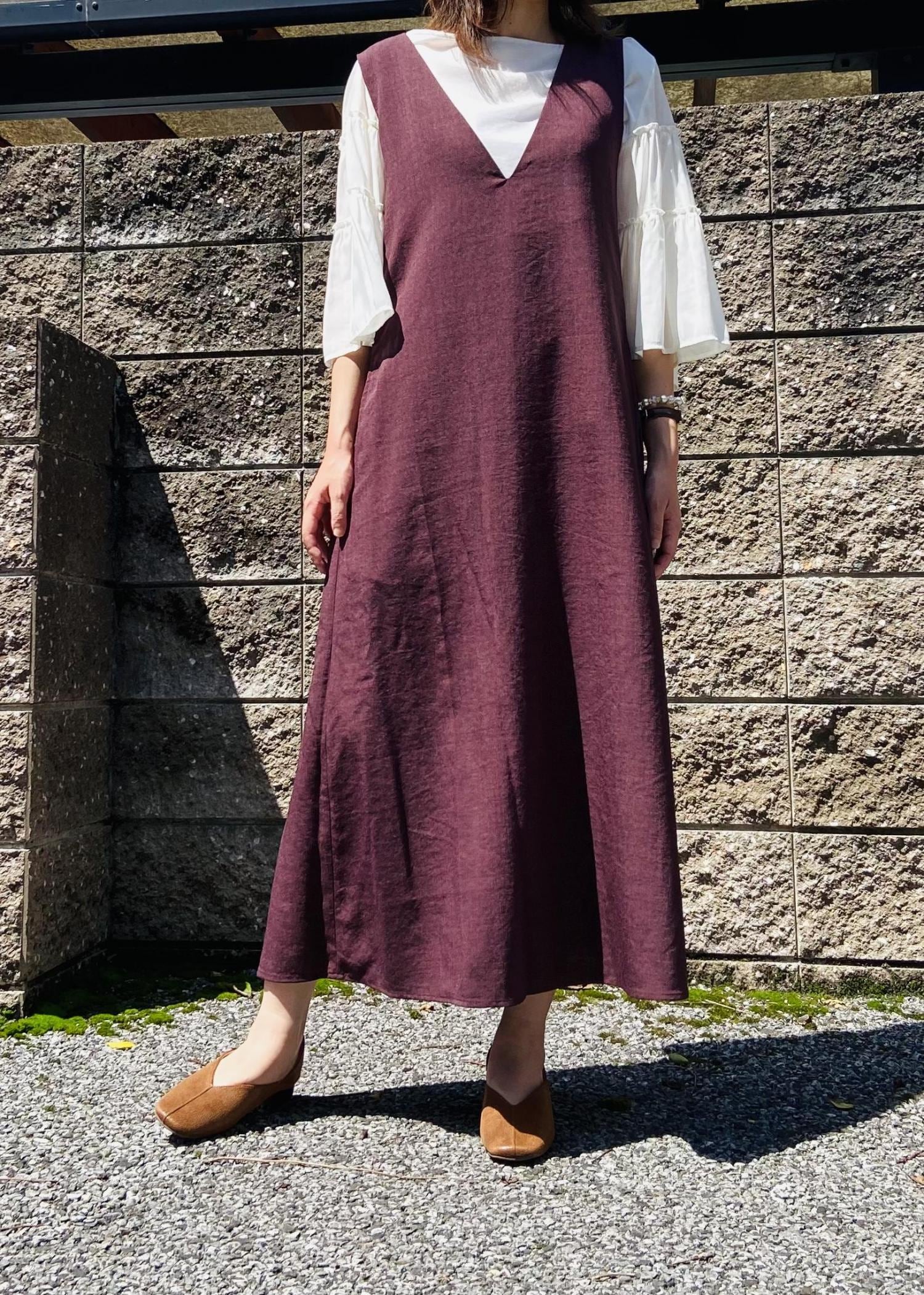 ダークブラウンのジャンスカとブラウンのパンプスで秋らしいカラーのコーデにしました。ジャンスカの色味は赤みのあるブラウンです。ティアードの袖のブラウスを下に着て、女性らしさを出しました!