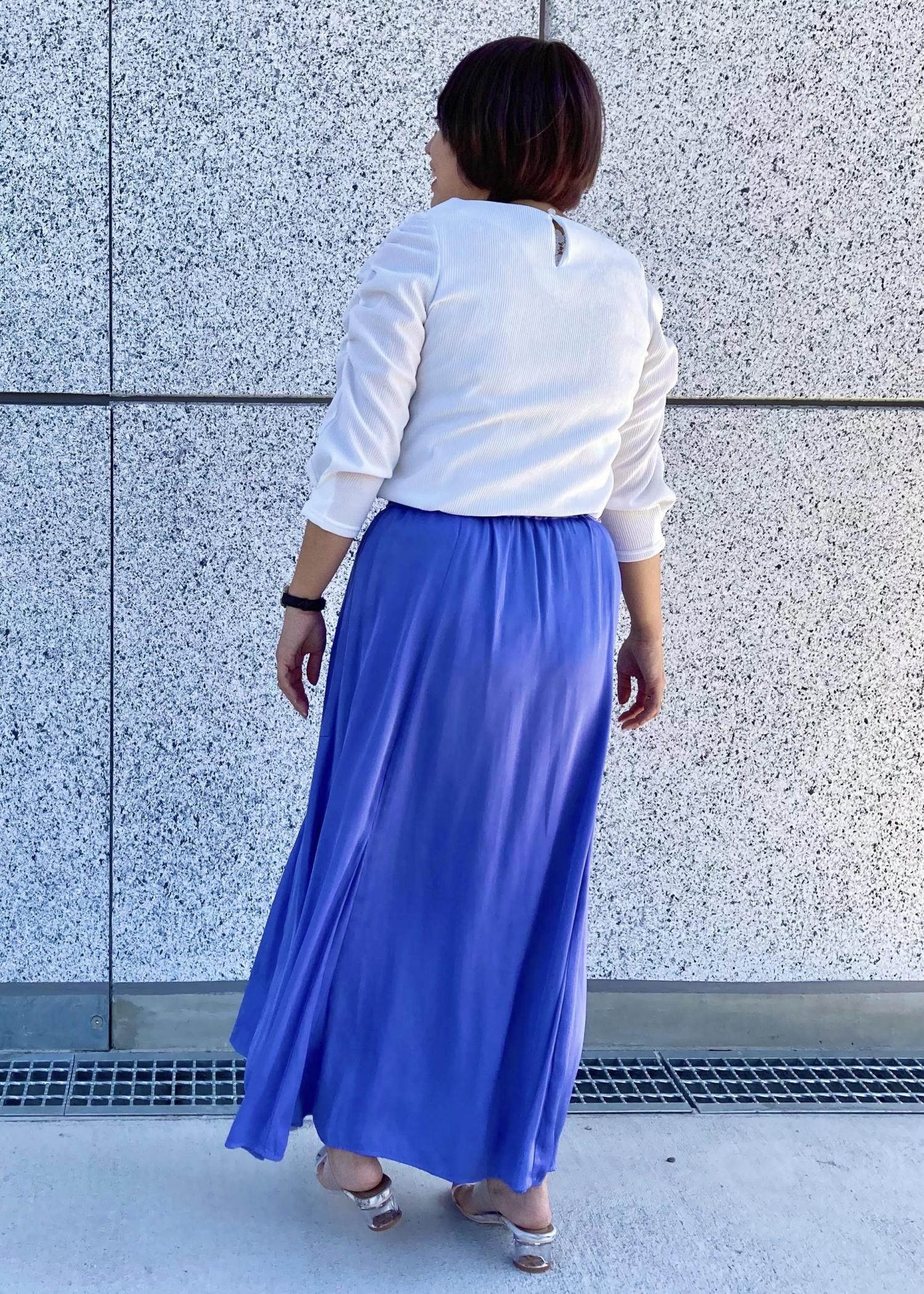 青みがかったきれいな色のパープルが映えるコーデです。 トップスもお袖にギャザーが入った物を使ってシンプルになりすぎないようにしました。 ヒールのあるサンダル使いできれい目感アップ!