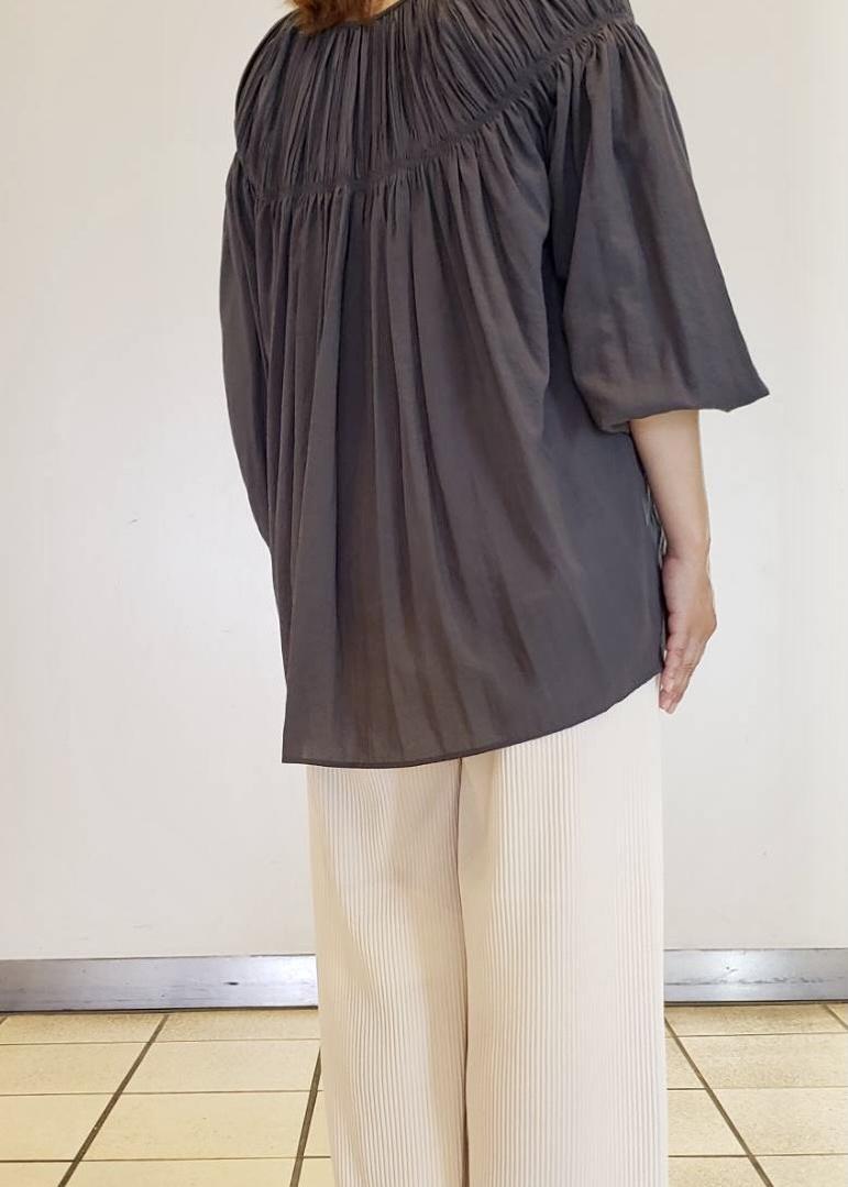 光沢があり上品なブラウスです。ゆったりめのお作りでリラックスして着て頂けます。