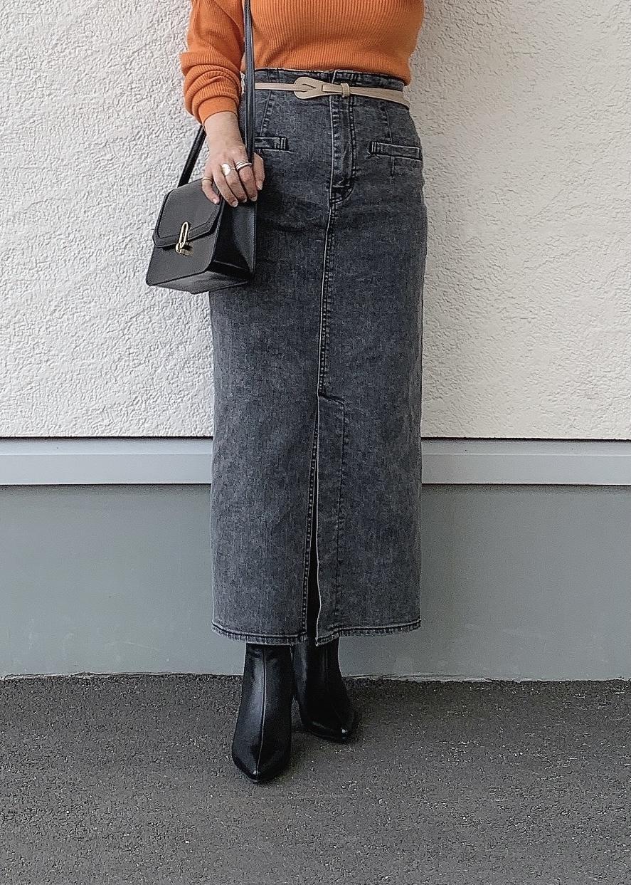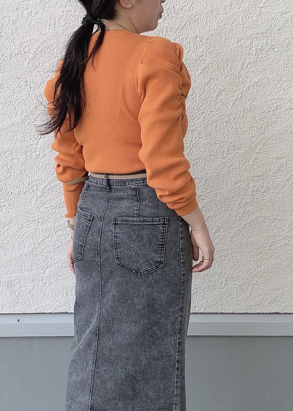 きれいなオレンジのニットを主役にしました。 ポップになりやすいカラーですが 他の色味を抑えてブーツと合わせることで子供っぽくなりません。 大人の女性にもおすすめなカラーコーデです!