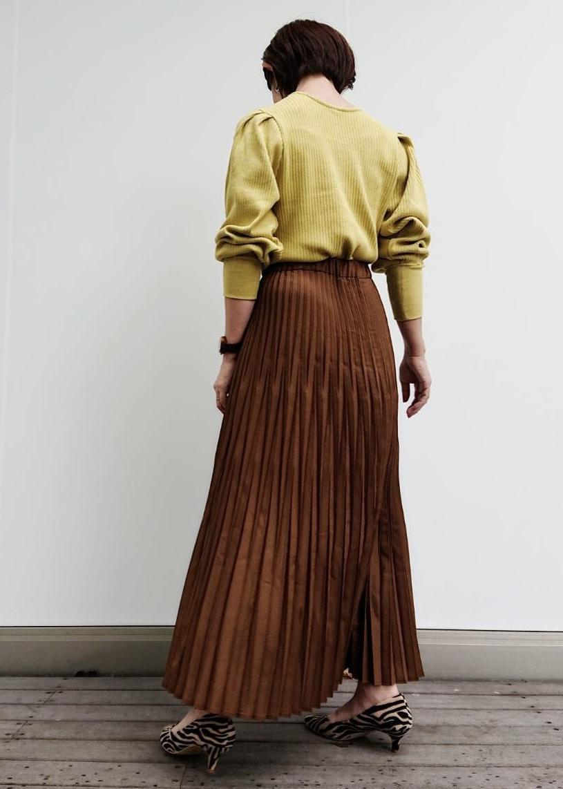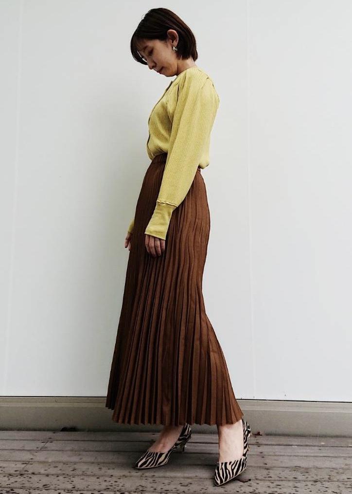 ボトムはこっくりとしたプリーツスカートを合わせて、全体的に落ち着いた色合いのスタイルです。