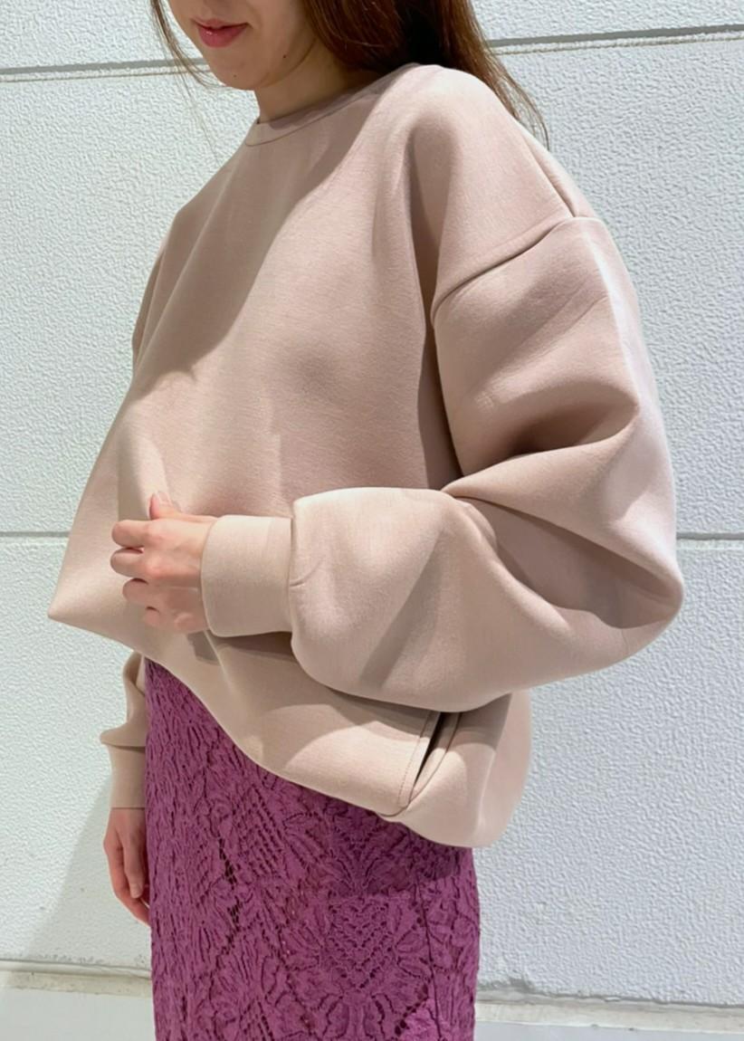 大人気スフレタッチのシンプルデザインのダンボールニットに、きれいめなタイトレーススカートをあわせたミックススタイルです。 小物はポインテットトゥのヒールのあるショートブーツとカチッとしたバックで女性らしい綺麗めな小物で合わせました。