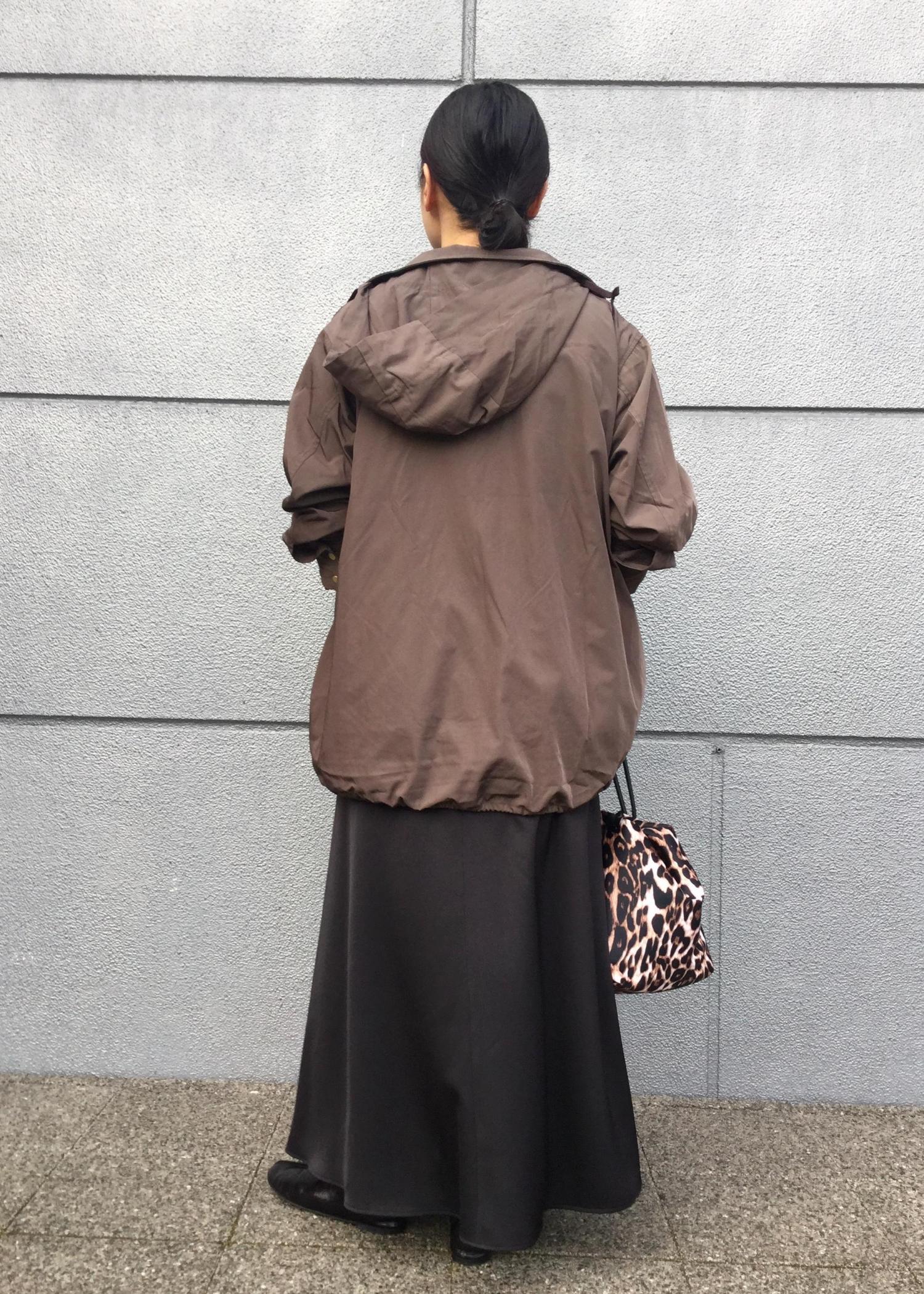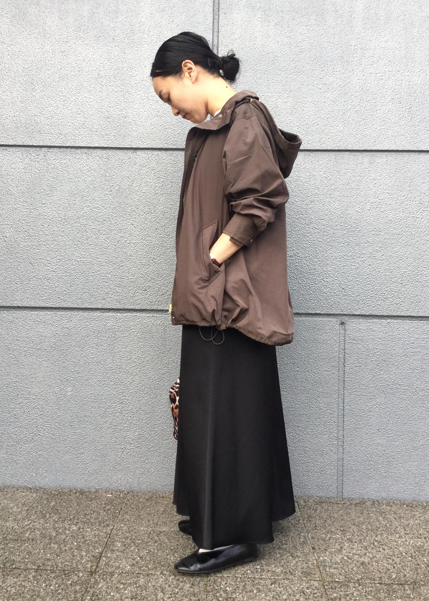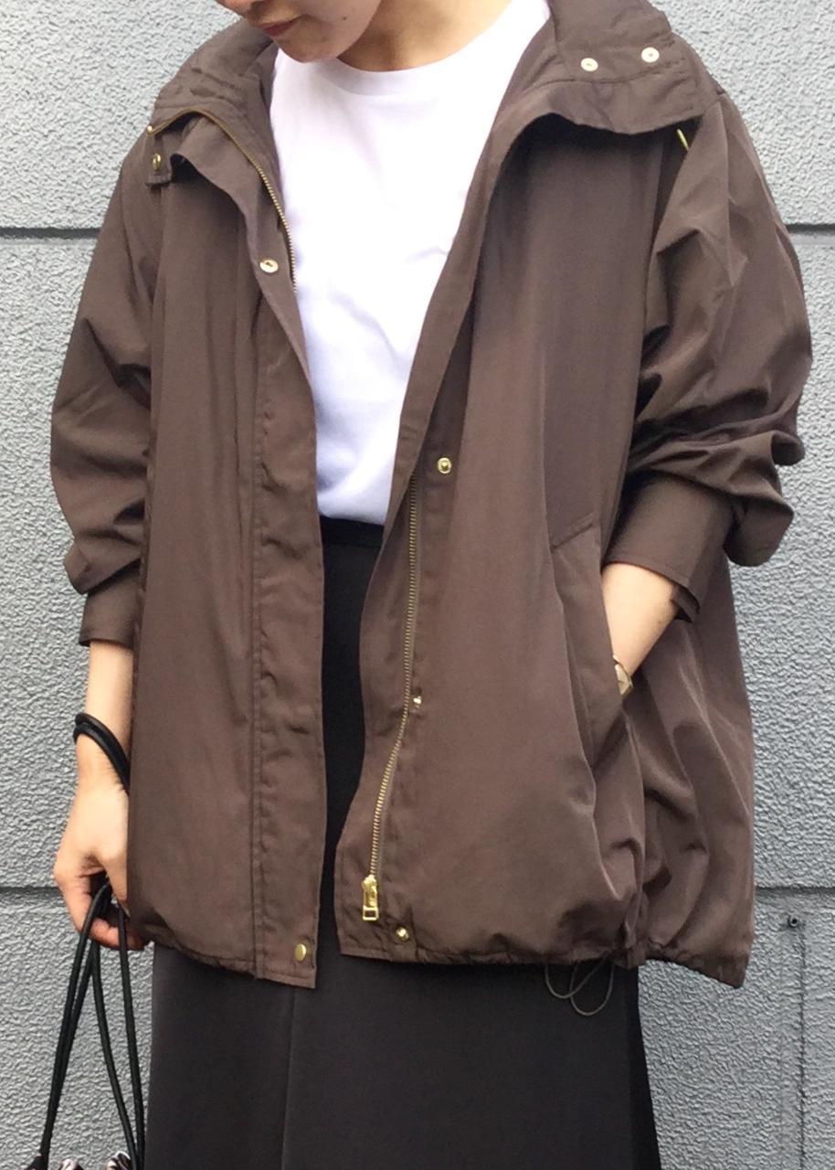 裾はドロストでシルエットを変えていただけ、スカート、パンツと合わせるアイテムも選ばないので日々の着こなしに大活躍するアウターです。