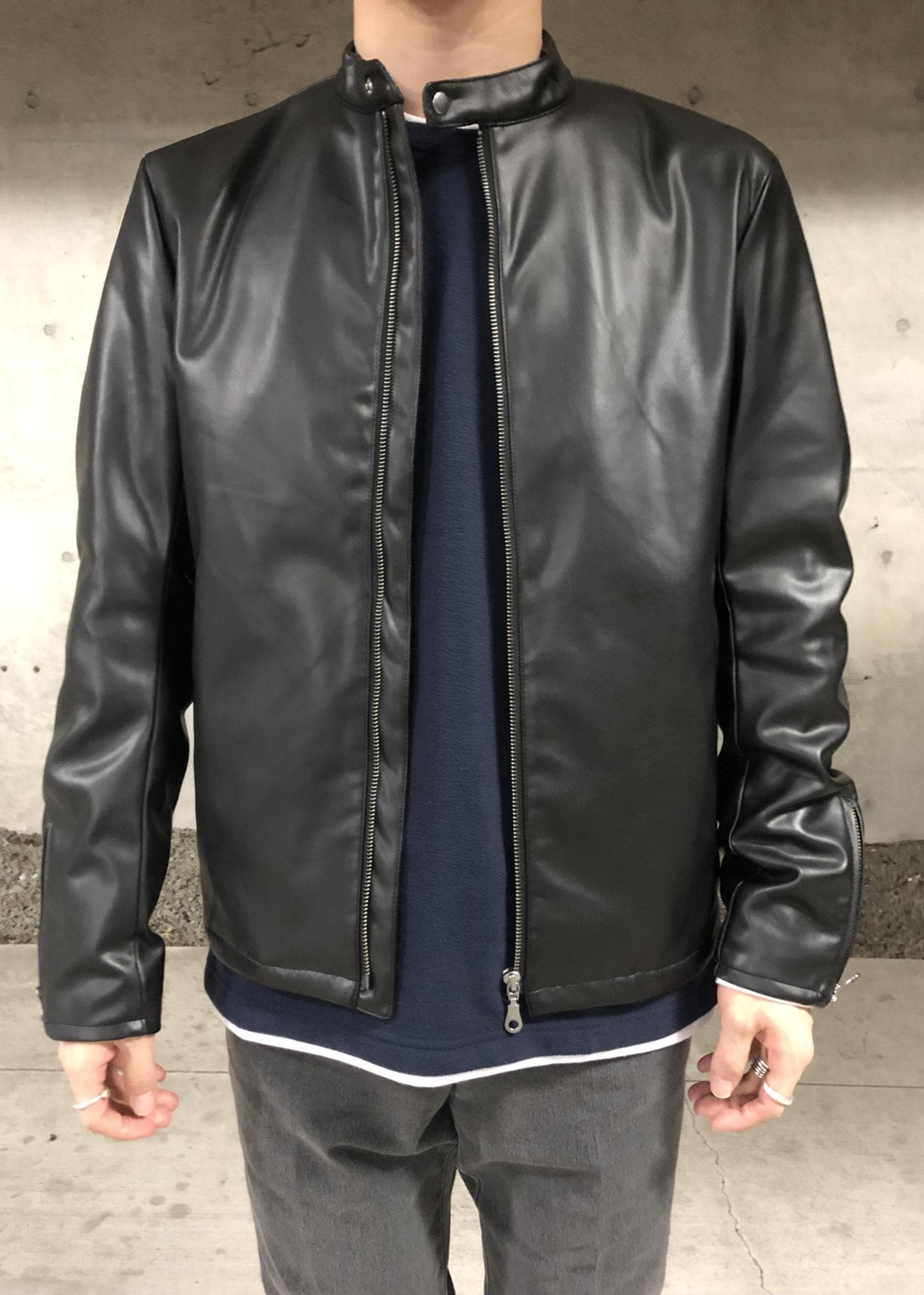 黒のライダースジャケットにデニムを合わせ、無骨なコーディネートを組みました。