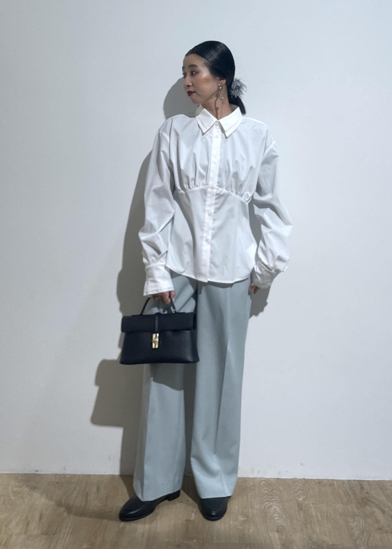 ブラウスからチラッと見えるショートパンツが脚長効果も◎