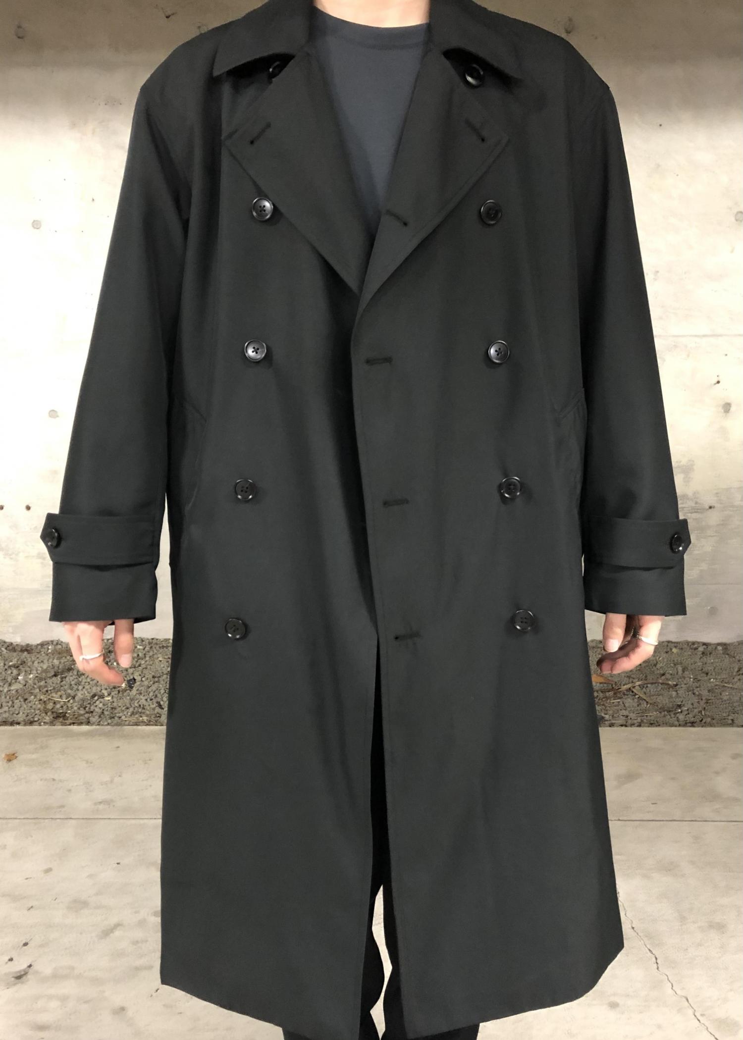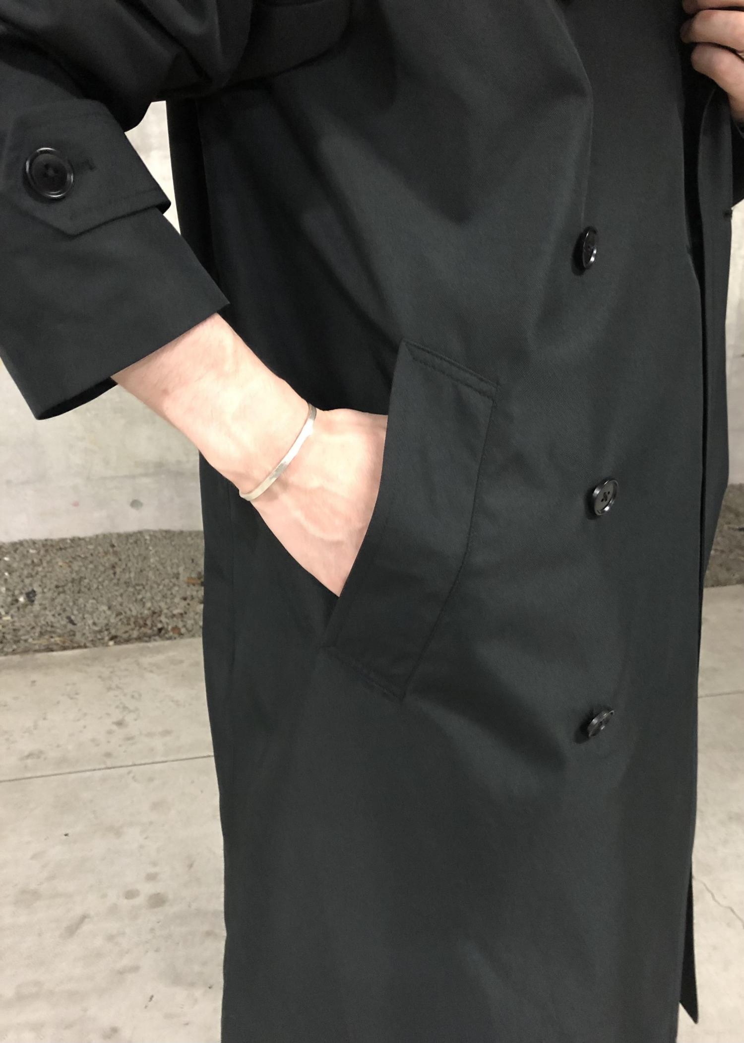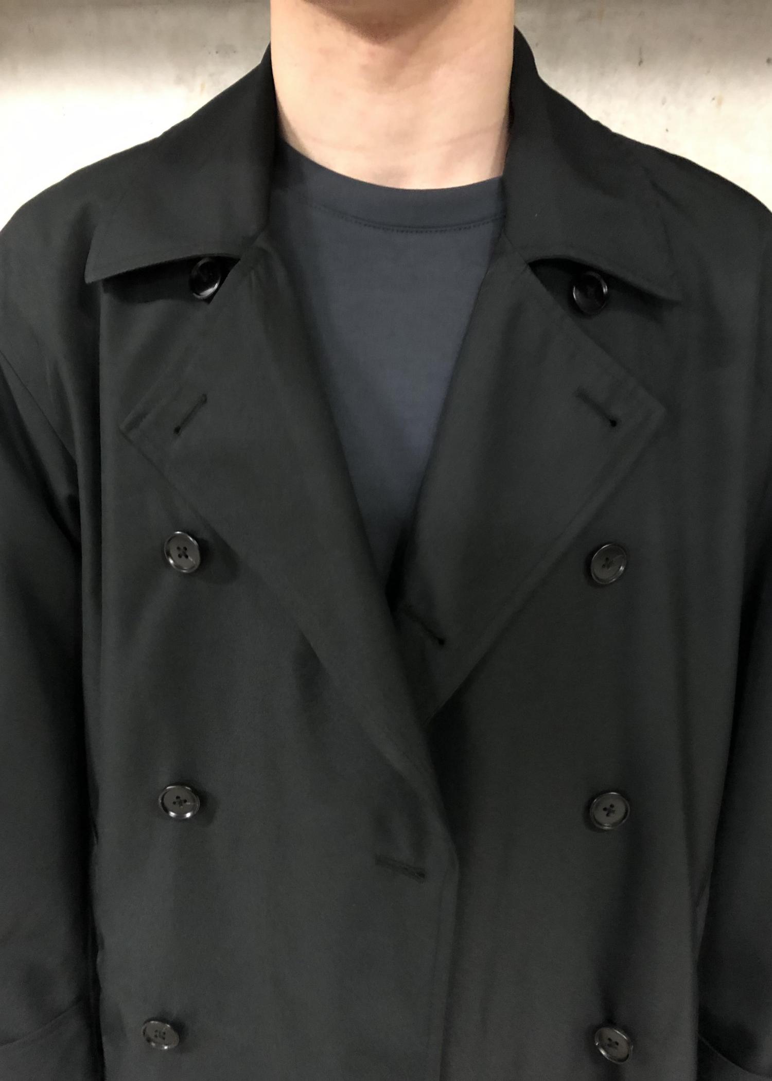 ブラックでまとめ、モード感のあるコーディネートを組みました。 着用のコンフィールツイルリラックストレンチコートは、大きすぎず、緩すぎず程よい抜け感のあるアイテムです。光沢のある上質な生地感で高級感も感じられます。裏地付きで袖通りが良いところも◎