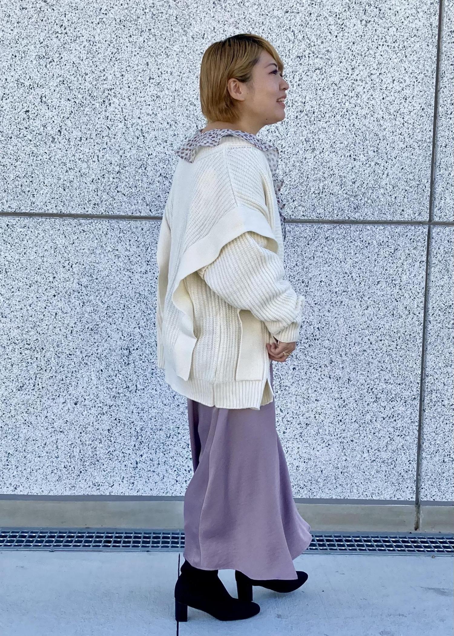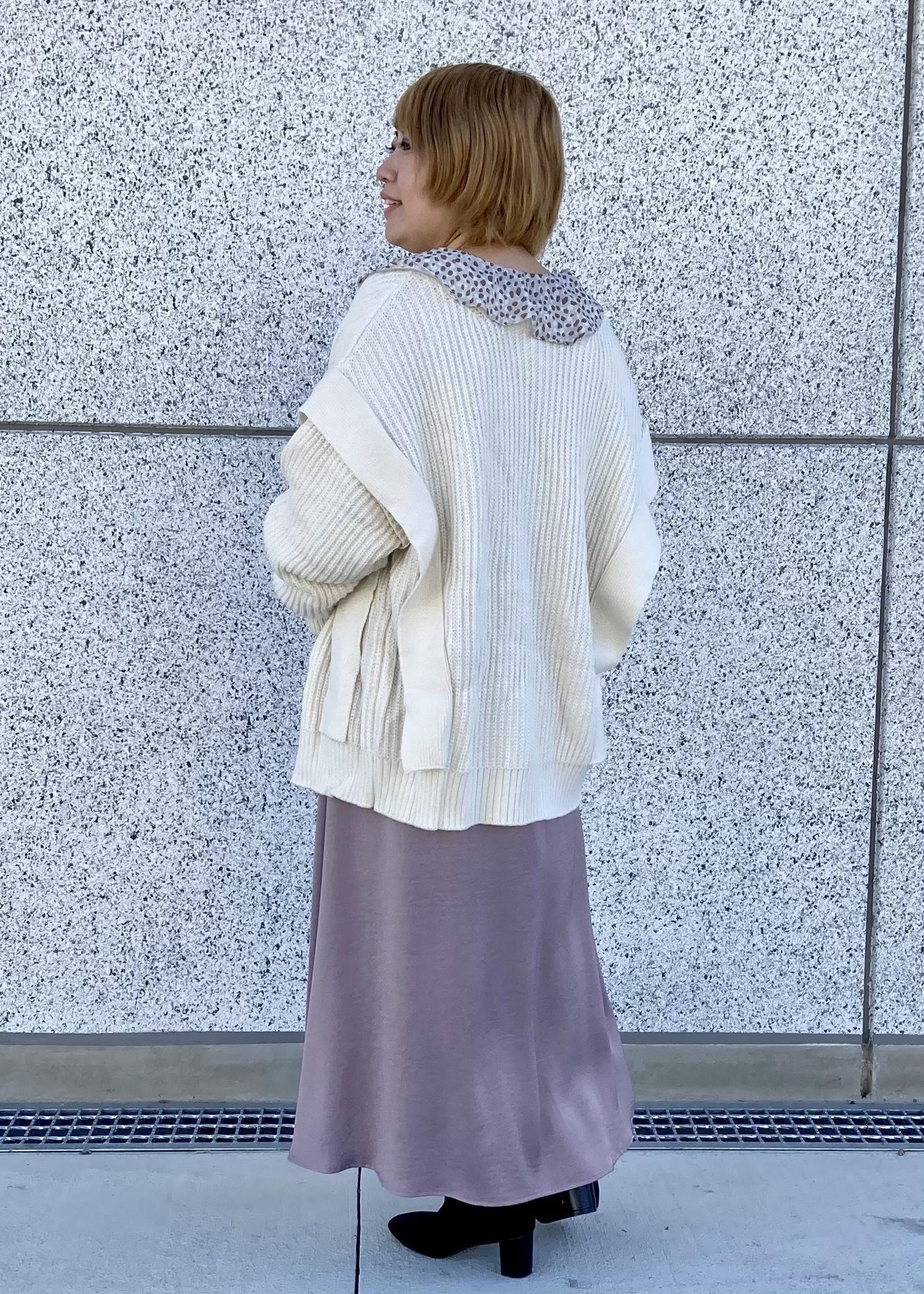 シルエットと素材がサテンのきれいめなスカートをオーバーサイズのニットでゆるっと感を出しました。