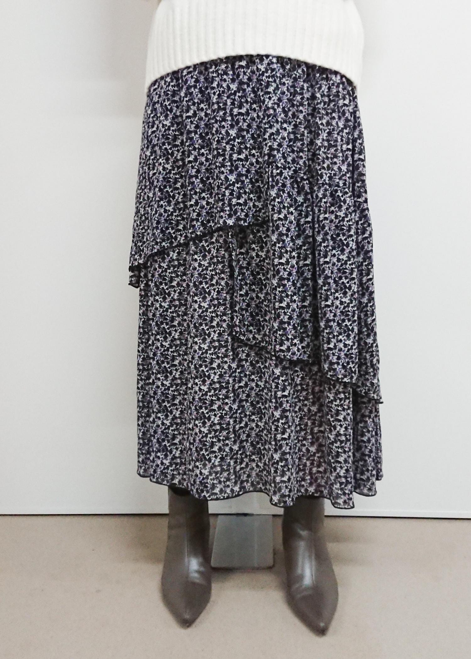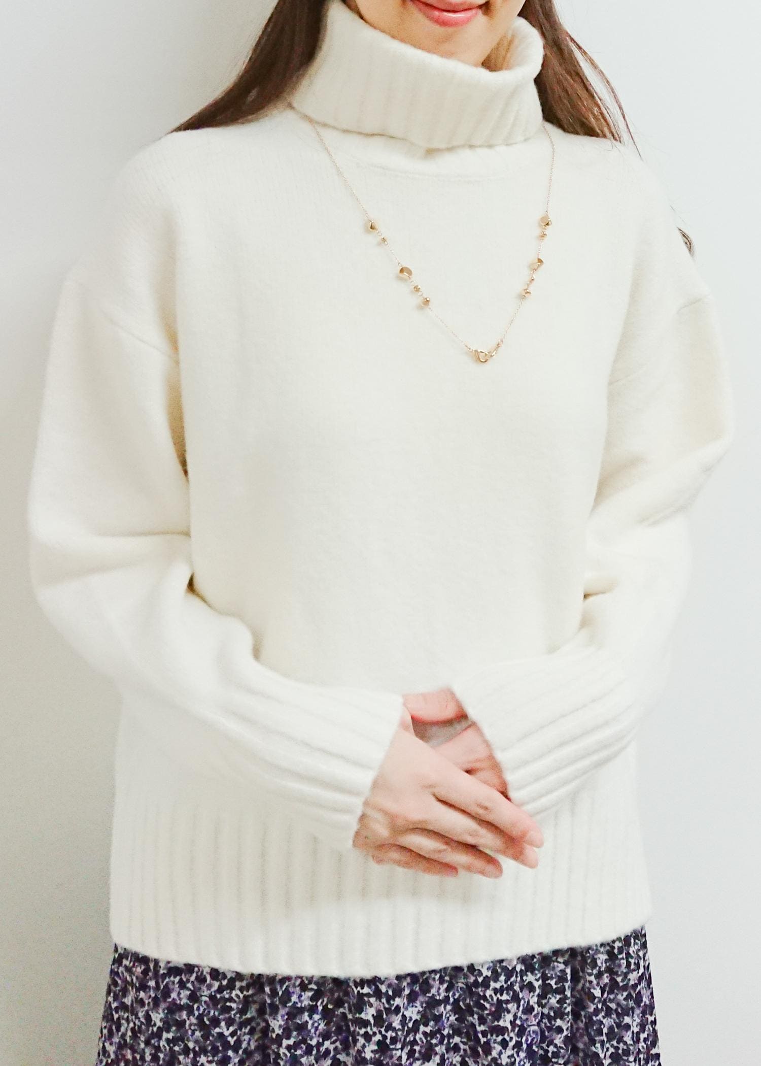 冬に着たいふわふわのタートルネックニットに花柄のロングスカートを合わせた好印象間違いなしの可愛らしいコーディネートにしました。 タートルネックニットは前が短め後ろが長めの丈になっているので、ロングスカートとのバランスがとりやすくおすすめな組み合わせです。