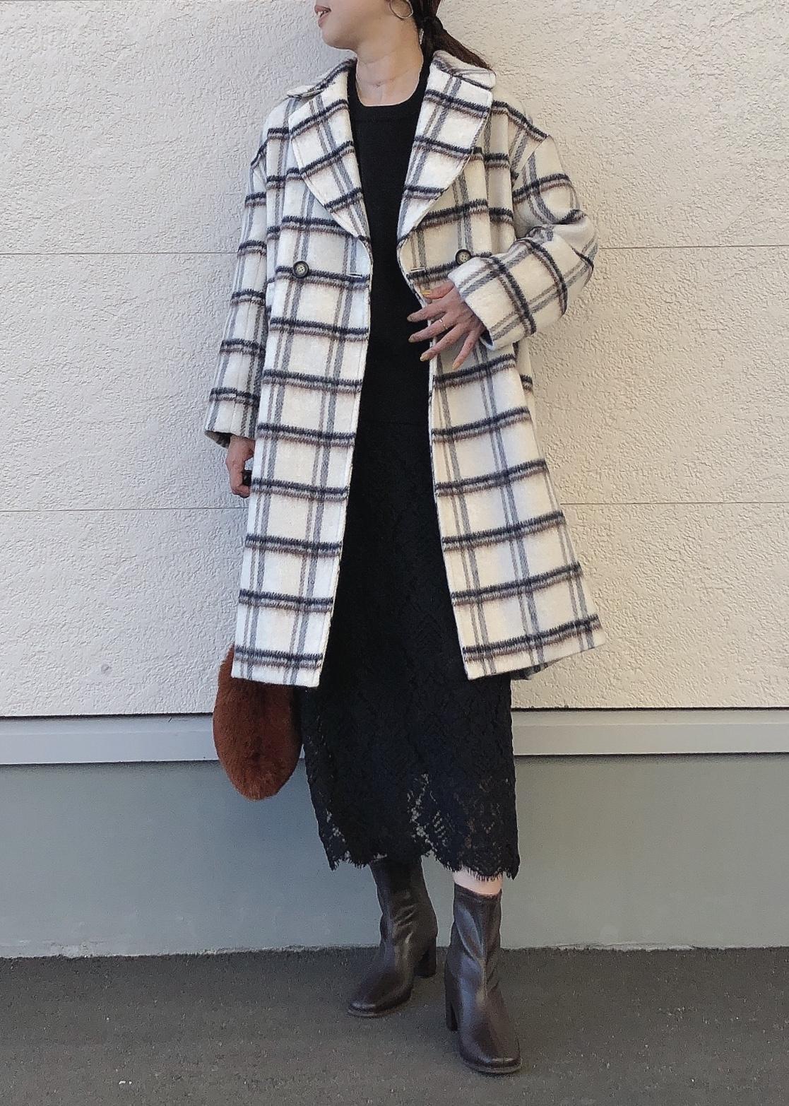 チェック柄コートを主役にインナーはモノトーンでまとめました。